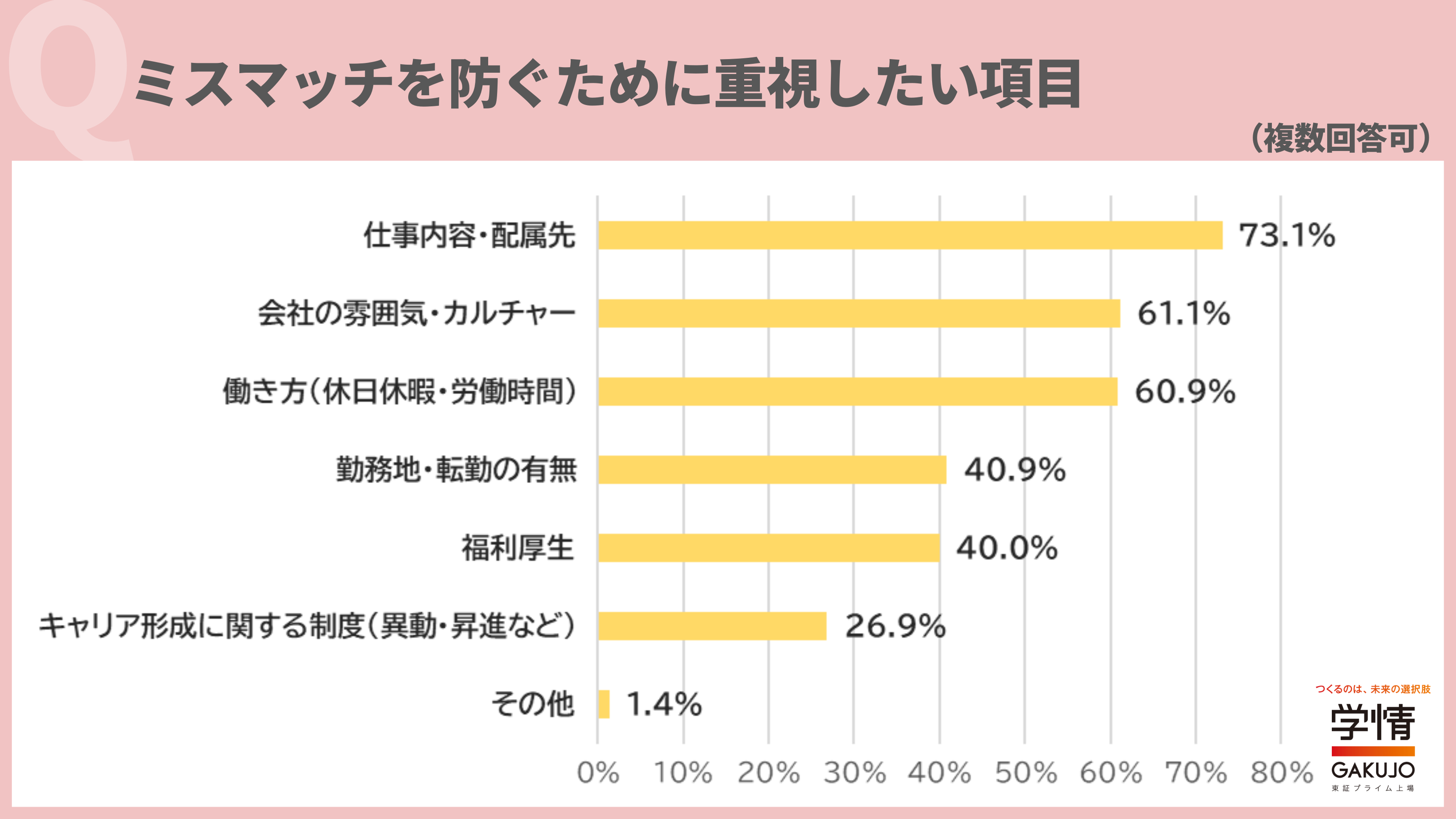 ミスマッチを防ぐために重視したい項目は、「仕事内容・配属先」が73.1%で最多。次いで、「会社の雰囲気・カルチャー」61.1%、「働き方(休日休暇・労働時間)」60.9%が続きました。「仕事内容が、やりたいことや適性と合致しているかは重要だと思う」「社風が合っているかは、自分らしく働くために必要だと思う」などの声が寄せられています。