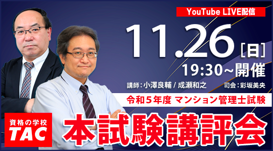 本試験当日にTACマンション管理士講座講師陣が本試験問題を検討し、予想正答番号と講評をLIVE配信でお伝えいたします!