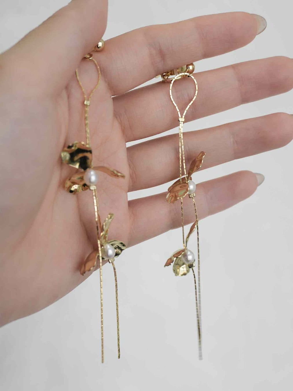 ゴールドのお花とまるい淡水パールを組み合わせたロングピアス・イヤリングです。お花のきらりとした輝きと淡水パールのやわらかな甘さが、耳元に華やかさと上品さを添えてくれます。特別な日には華やかに、普段の装いにも自然になじむアクセサリーです。
