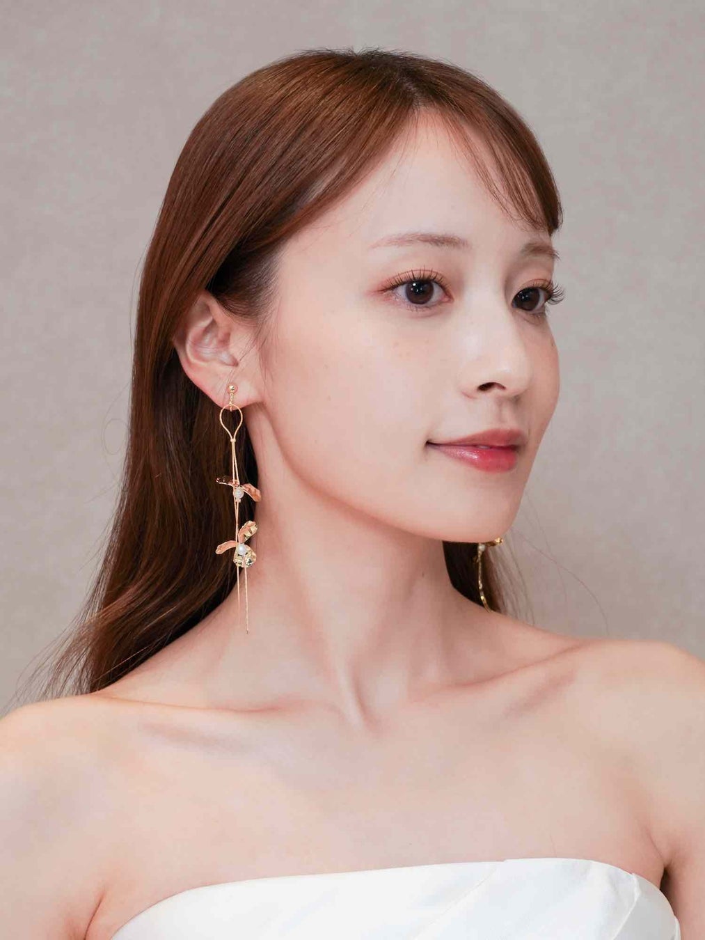 マットゴールドのお花の中央に淡水パールをあしらいました。お花の下には艶のあるホワイトビーズを飾り、耳元で軽やかに揺れるデザインです。あたたかみのあるゴールドの色味とビーズの柔らかな質感が、女性らしい雰囲気を演出します。