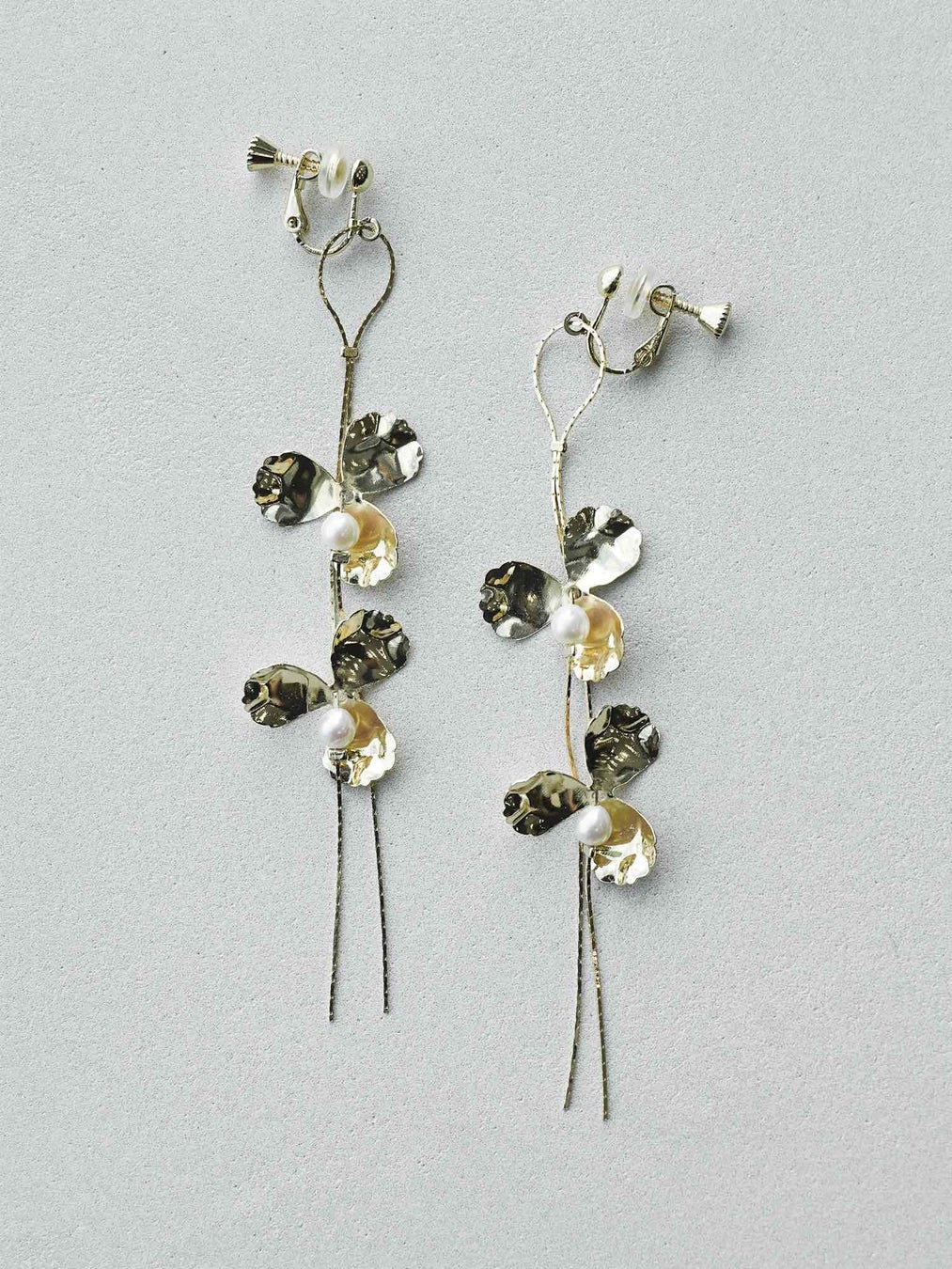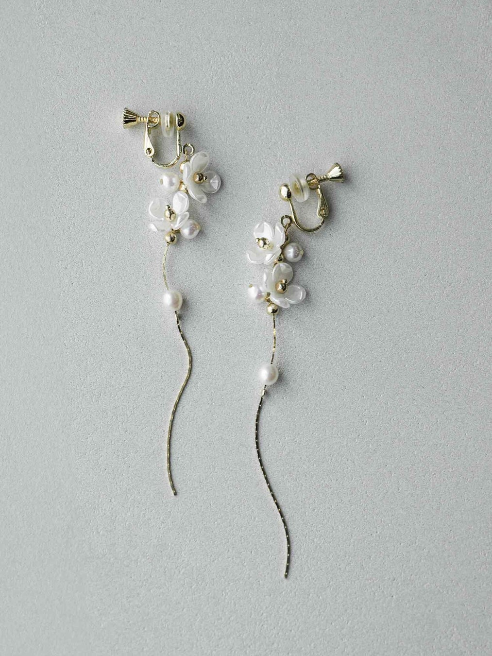 小さなホワイトフラワーとまるい淡水パールを組み合わせた、可憐で華奢な印象のロングピアス・イヤリングです。繊細なディテールが、耳元に軽やかさと上品なきらめきを与えてくれます。