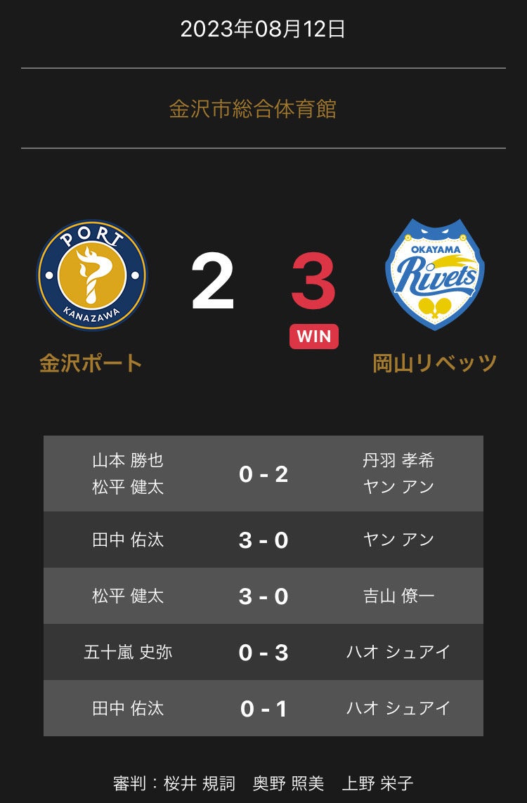 ノジマTリーグ 2023-2024シーズン 公式戦 8月12日開催 金沢ポート vs 岡山リベッツ 試合結果