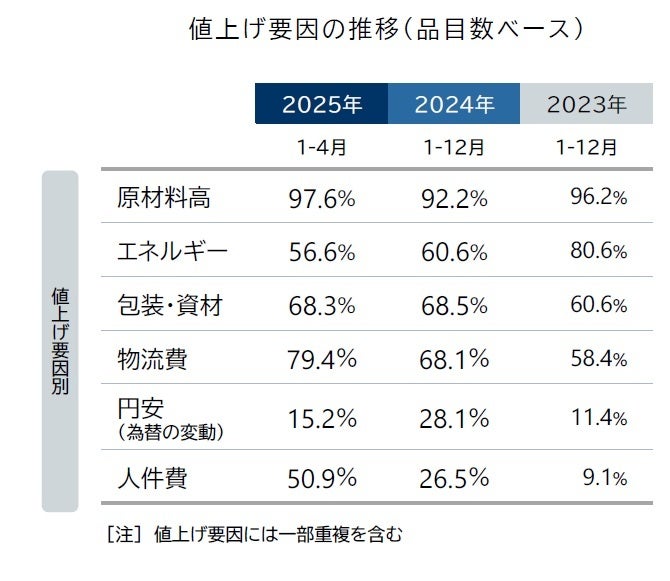 値上げ要因では、2024年のトレンドを引き継ぎ原材料などモノ由来の値上げが多くを占める一方で、人件費や物流費など「サービス」価格上昇の影響を受けた値上げが拡大し、値上げ品目数の押し上げ要因となっている。25年の値上げ要因のうち、最も大きいものは「原材料高」(97.6%)となり、3年連続で値上げ品目全体の9割を超えた。他方で、トラックドライバーの時間外労働規制などが要因となった輸送コストの上昇分を価格に反映する「物流費」由来の値上げは79.4%を占め、集計開始以降で過去最高となった。最低賃金の引き上げや定期昇給など賃上げによる影響を含む「人件費」由来の値上げも50.9%と、初めて値上げ品目数のうち半数を超えた。「エネルギー」(56.6%)、「円安」(15.2%)由来の値上げ割合は前年を下回った。