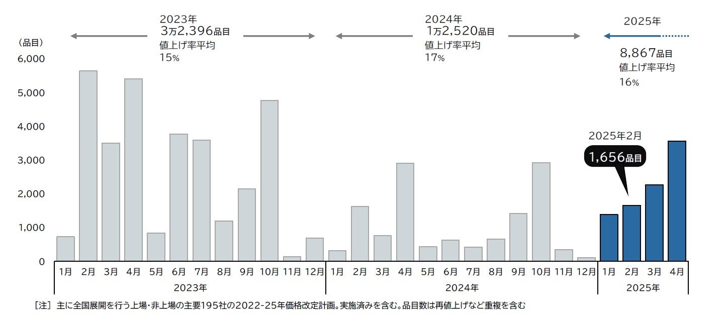 2025年2月の飲食料品値上げは1656品目、前年同月から30品目・1.8%増加した。