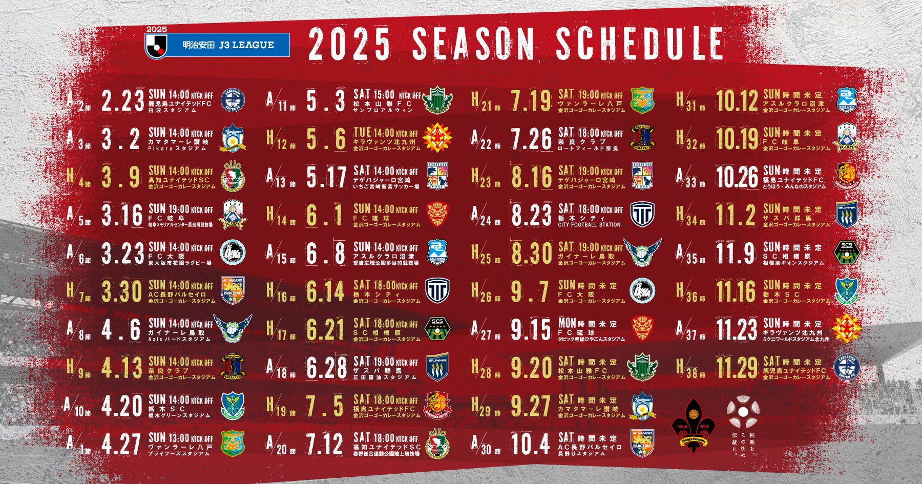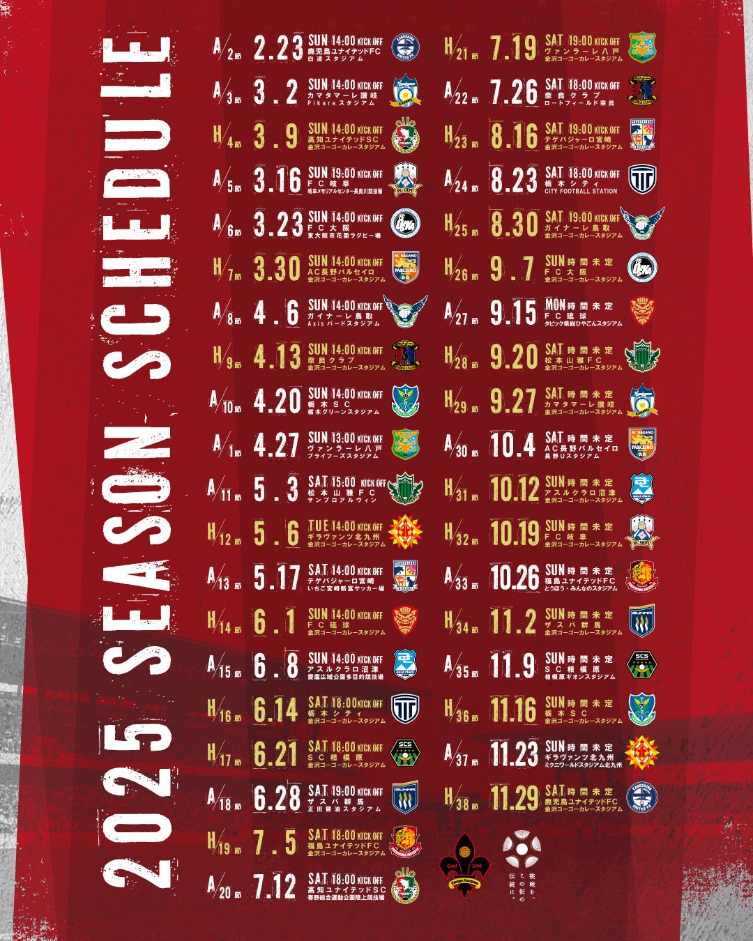 2025シーズンの明治安田J3リーグ、ツエーゲン金沢の試合日程が決定いたしました。