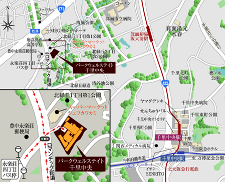 北大阪急行電鉄「千里中央」駅より車約10分・約3,070m (本レジデンス間に専用シャトルバス運行) |