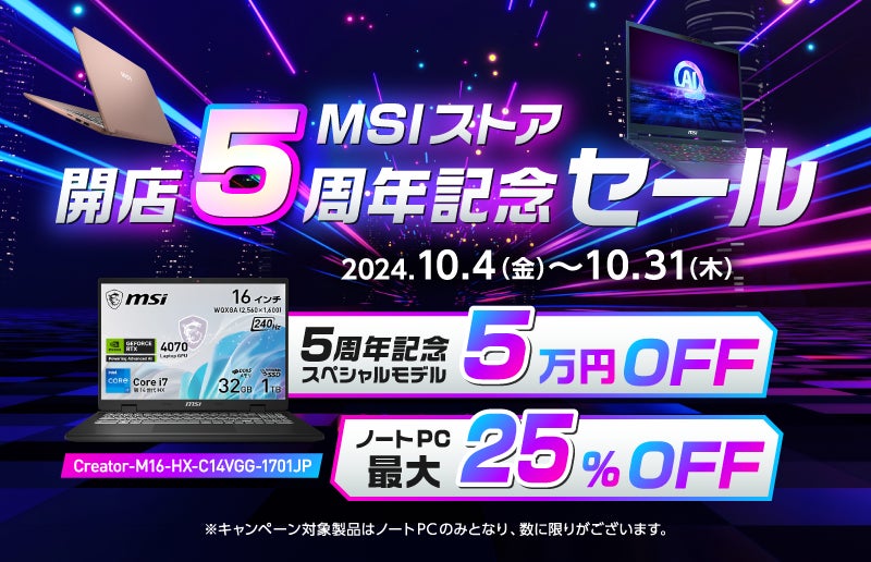 【スペシャルモデルを期間限定で5万円オフ、対象ノートPCが最大25%オフ!MSIストア開店5周年特別セール開催!】