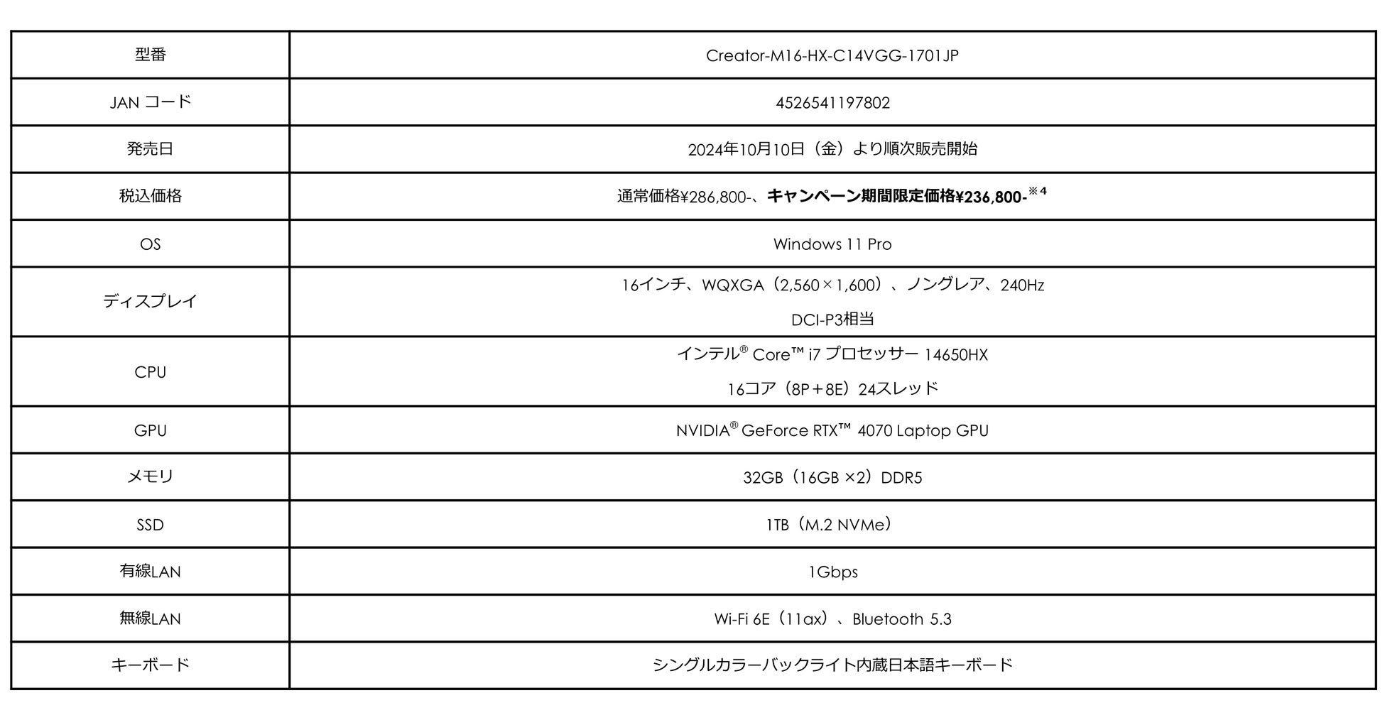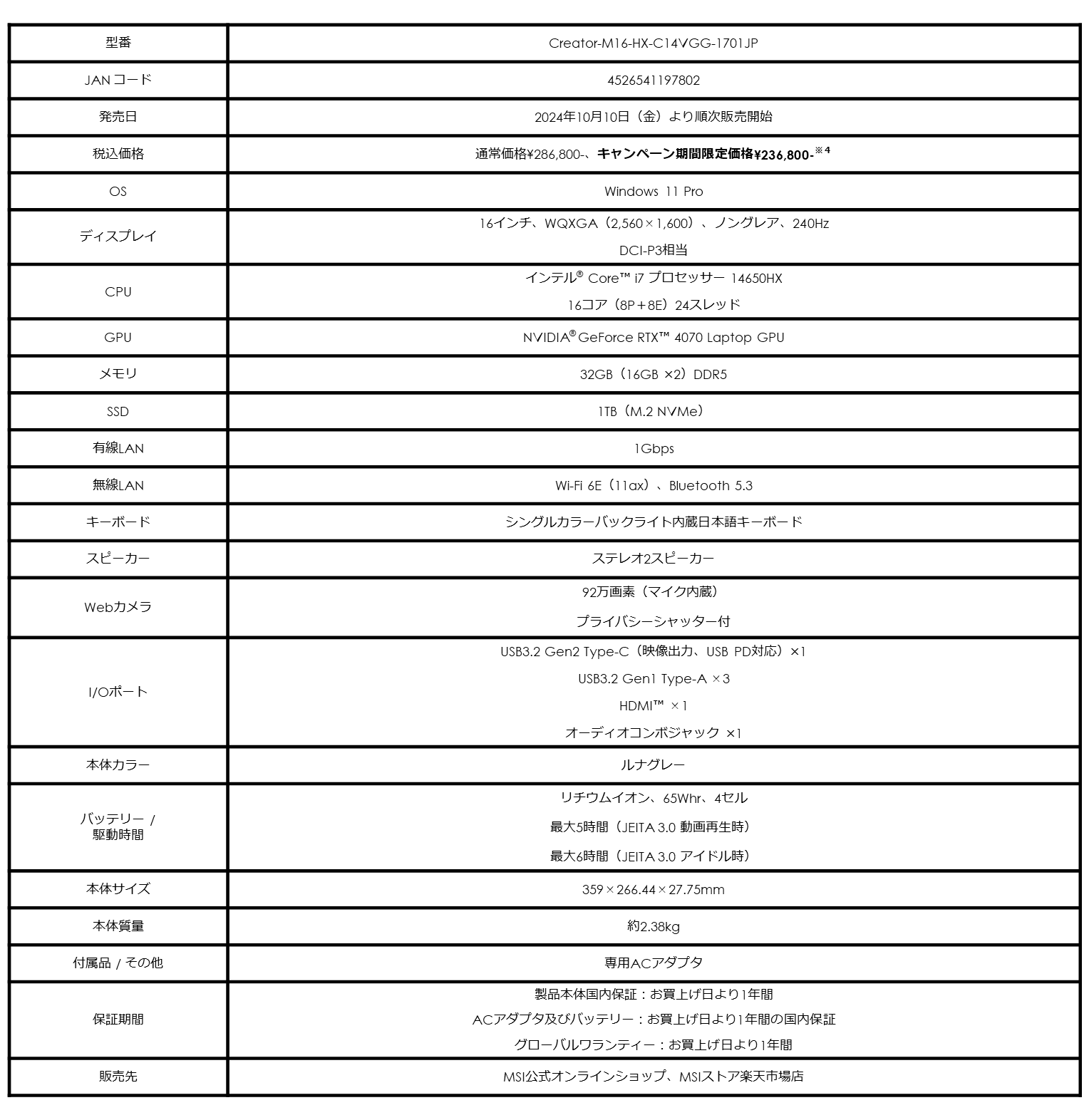 「Creator-M16-HX-C14VGG-1701JP」MSIストア販売ページ:https://jpstore.msi.com/shopdetail/000000000777