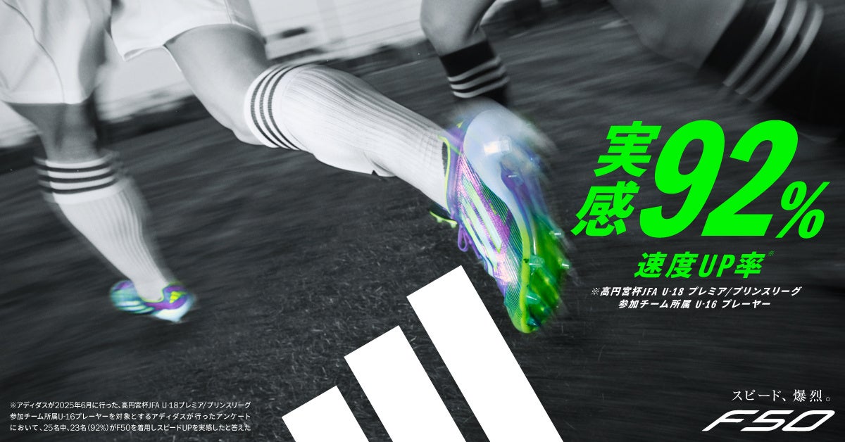 アディダスが2025年6月に行った、高円宮杯JFA U-18 プレミア/プリンスリーグ参加チーム所属 U-16 プレーヤーを対象とするアディダスが行ったアンケートにおいて、25名中、23名(92%)がF50を着用しスピードUPを実感したと答えました。