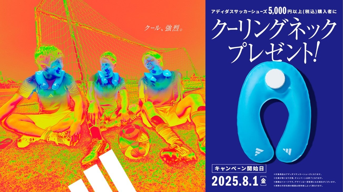暑い中プレーに励む部活プレーヤーに向けて、アディダスサッカーシューズを税込5,000円以上のご購入者限定で、暑い時期の練習に役立つ、アディダスロゴ入りクーリングネックがもらえるキャンペーンを実施いたします。2025年8月1日(金)より、アディダス オンラインストアを含む、全国約700店のアディダスお取り扱い店舗にて実施予定。在庫が無くなり次第終了いたします。