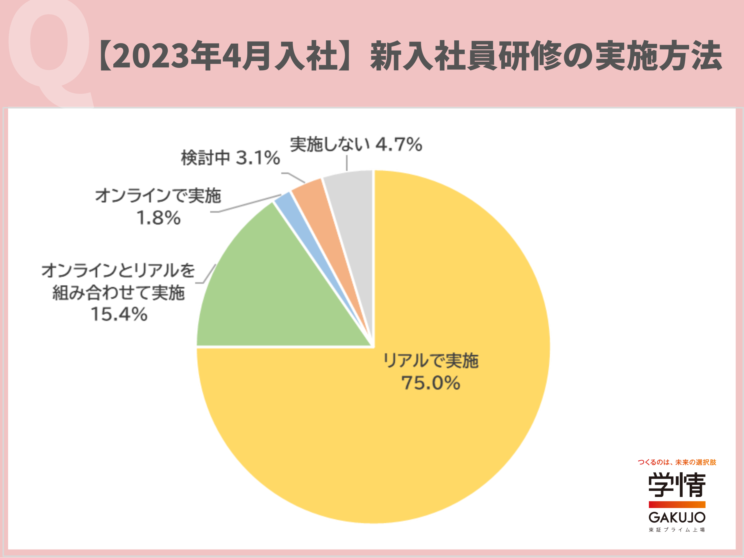 2023年4月入社の新入社員研修について、「リアルで実施」と回答した企業が75.0%に上りました。「リアル」で実施する企業の割合は、前年(61.9%)より、13.1ポイント増加しています。「リアルでの研修のほうが理解度を把握しながら進めることができる」「オンボーディングのためには対面のコミュニケーションが必要だと思う」「一緒に研修に参加することで同期との人間関係を築いて欲しい」「コロナ禍でオンラインとリアル両方で実施し、リアルのほうが、戦力化が早いことが分かった」などの声が寄せられました。