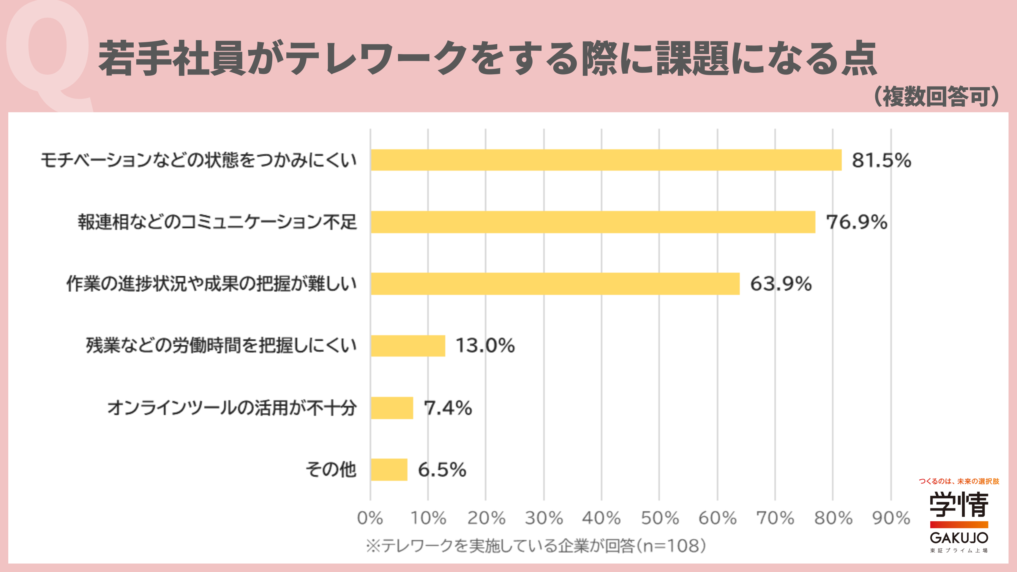 若手社員がテレワークをする際に課題になる点は、「モチベーションなどの状態をつかみにくい」が81.5%で最多。次いで「報連相などのコミュニケーション不足」76.9%、「作業の進捗状況や成果の把握が難しい」63.9%が続きました。