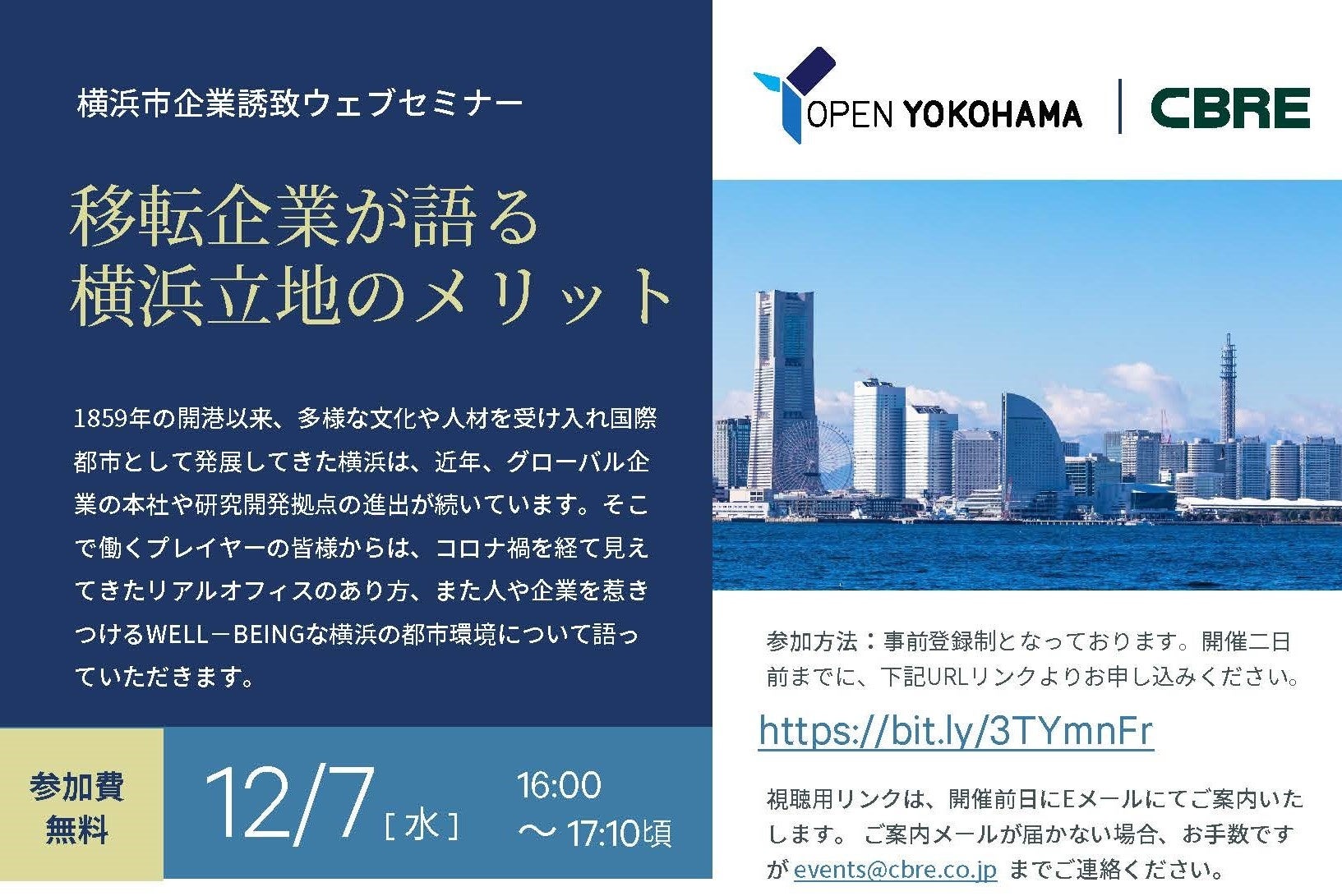 この度、横浜市は「横浜市企業誘致セミナー」をオンライン開催します。山中 竹春 横浜市長からのメッセージをはじめ、実際に横浜に移転された企業の担当者が語る横浜立地のメリットやビジネス環境をご紹介するとともに、みなとみらいをはじめとする横浜市ビジネスエリアのポテンシャルや新規竣工オフィスビル、企業立地支援制度をご紹介します。