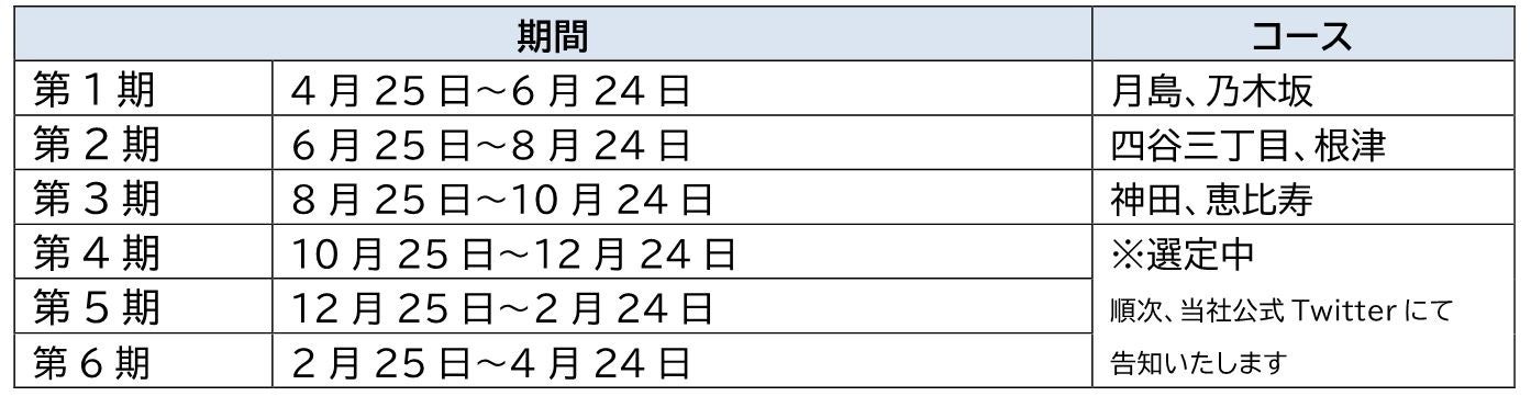 2023年4月25日(火)から2024年4月24日(水)までを2か月ごとに分けて実施いたします。なお、第4期から第6期のコースは現在選定中です。順次、東京メトロ公式Twitter等で告知いたします。ご期待ください!