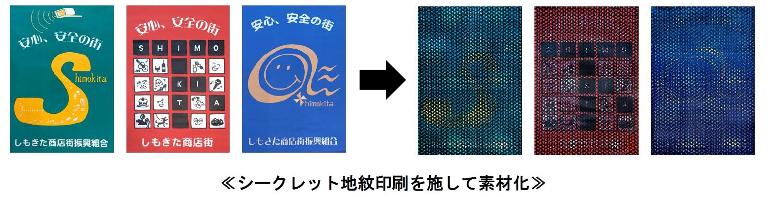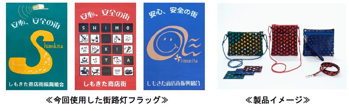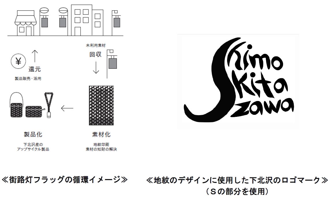 本実証実験では、掲出終了後は廃棄されてしまう商店街の街路灯フラッグに、知的財産権を認知できなくさせるシークレット地紋をかけることで下北沢産の新たな素材として生まれ変わらせます。また、その素材を活用したアップサイクル製品を製作し、販売することで下北沢の人々に循環させる仕組みを構築します。古着屋が集まる街のひとつでもあり、音楽や演劇などのカルチャーも盛んな下北沢の、廃棄されゆく素材の循環が下北沢のカルチャーのひとつとすることを目指します。