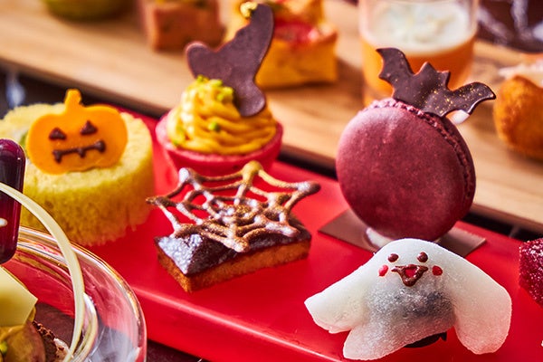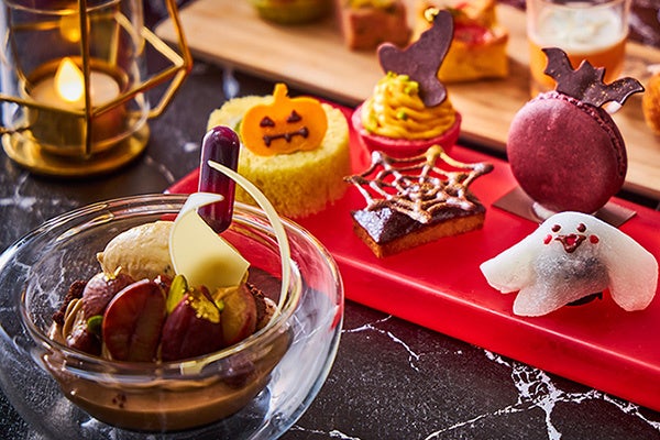 かぼちゃパウダーを使用したジャック・オ・ランタンのロールケーキ、巨峰をぎゅうひで包んだ可愛らしいおばけのスイーツなど、ハロウィン気分を味わえるドルチェが並びます。その他、フランボワーズソースで仕上げる白ぶどう&赤ぶどうのジュレや、チョコレートのトッピングが可愛らしいかぼちゃクリームとビーツのタルトやマカロンなどをお楽しみください。