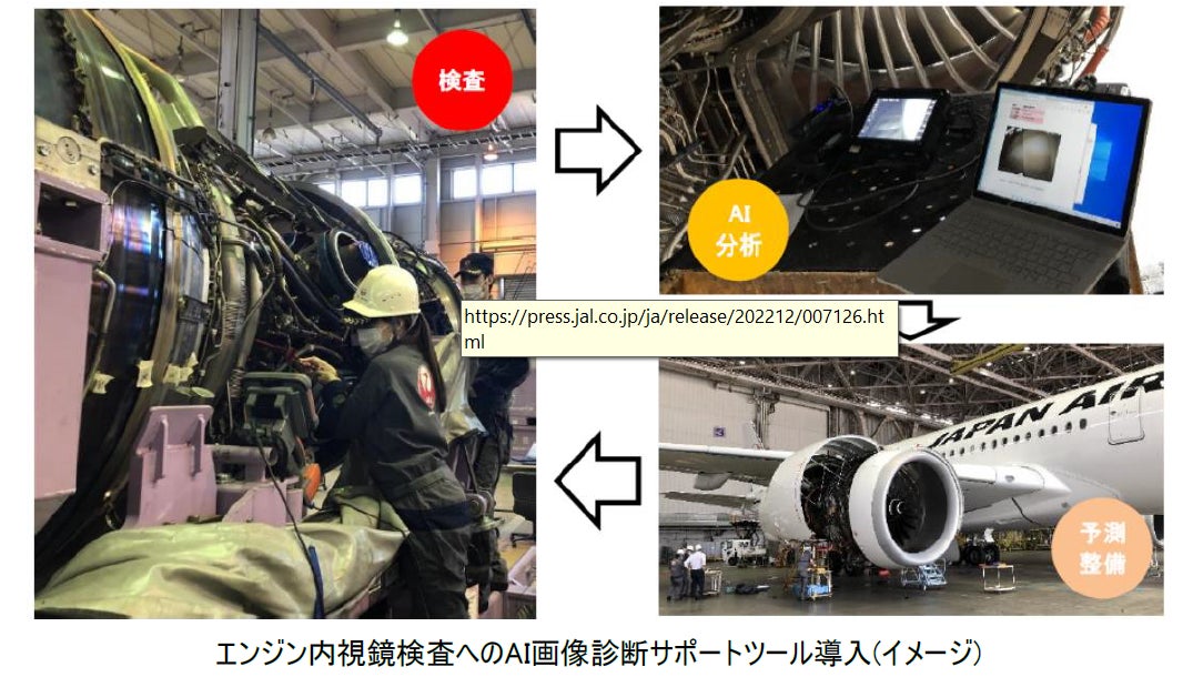 2022年12月20日付けプレスリリース『JALとクレスコ、医療AIによる画像認識技術を活用した「航空機エンジン内部検査ツール」を開発』 URL:https://press.jal.co.jp/ja/release/202212/007126.html