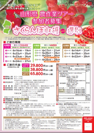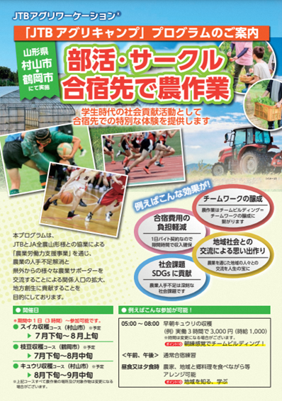 そこで今回、JA全農山形とJTBの農作業受委託事業を基盤として、山形県も連携し、農業の労働力不足を解消するとともに、農業を起点としたあらたな関係人口の創出・拡大による地方創生をめざすことを目的としております。