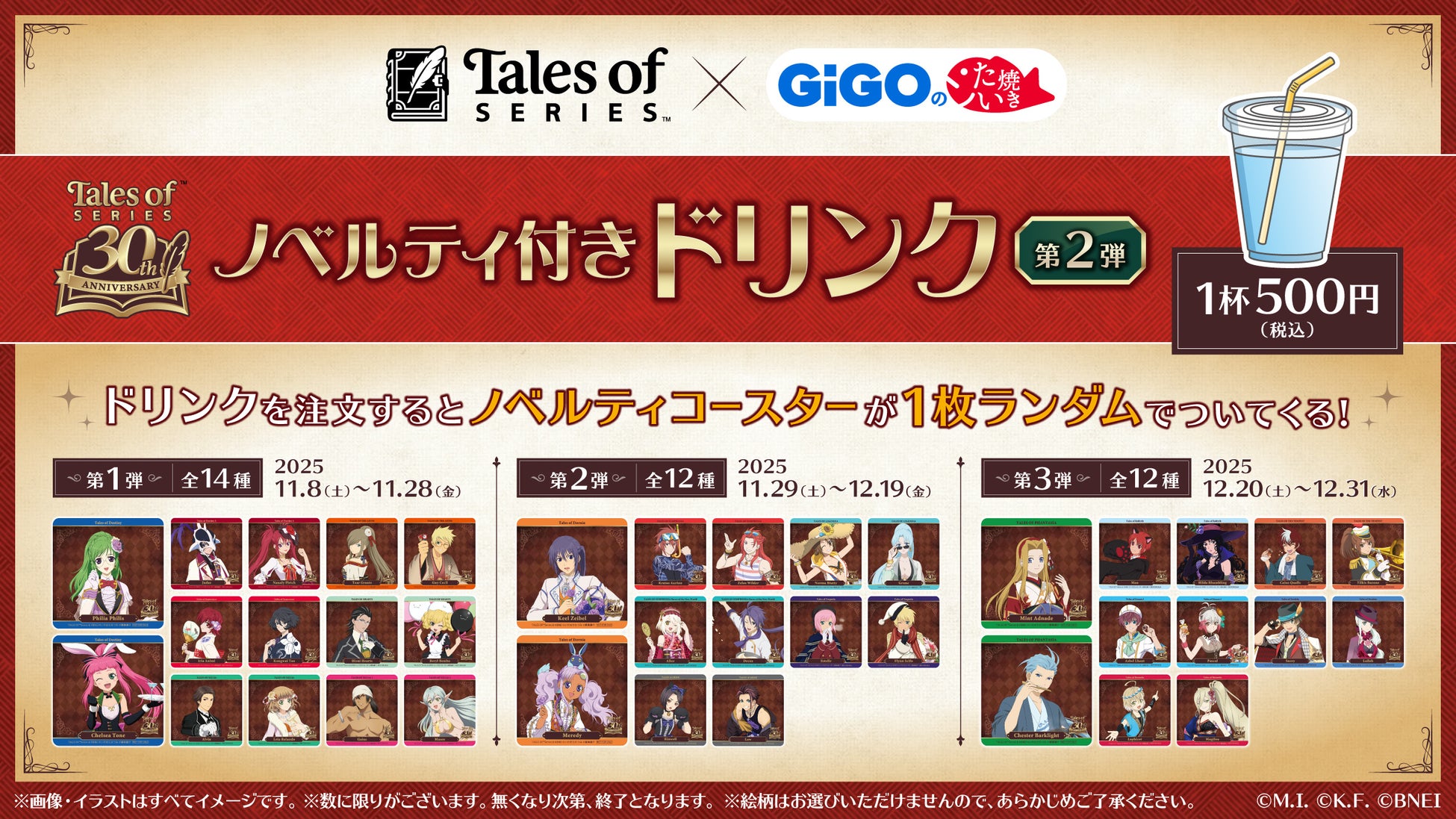 株式会社GENDA GiGO Entertainment(本社:東京都港区 代表取締役社長:二宮 一浩、以下「当社」)は、当社の対象店舗において、今年でシリーズ30周年を迎えるゲーム『テイルズ オブ』シリーズとコラボレーションしたキャンペーン第2弾を開催いたします。
