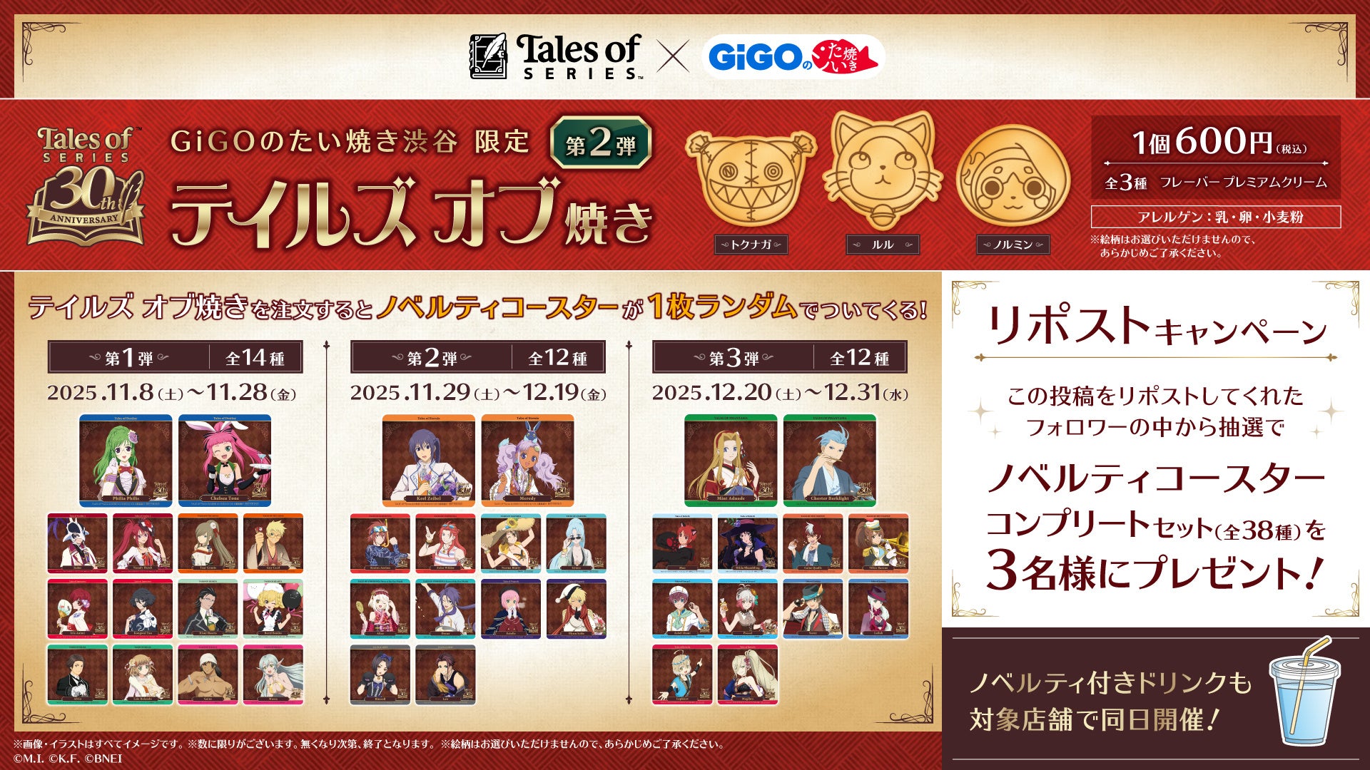 GiGOのたい焼き渋谷にて『テイルズ オブ』シリーズの各タイトルで活躍するマスコットキャラクターのうち、「テイルズ オブ ジ アビス」より「トクナガ」、「テイルズ オブ エクシリア2」より「ルル」、「テイルズ オブ ゼスティリア」より「ノルミン」をモチーフにした「テイルズ オブ焼き」を販売いたします。「テイルズ オブ焼き」を1点ご購入につき、オリジナルコースターをランダムで1枚進呈いたします。
