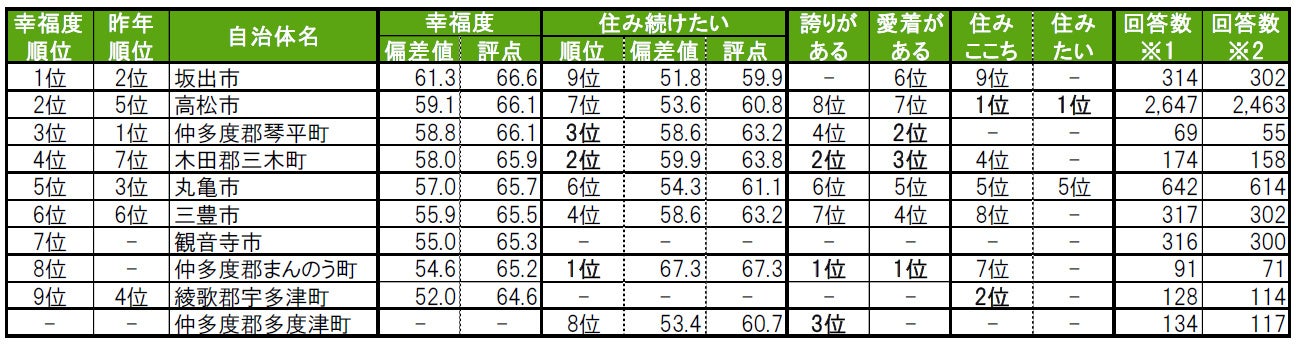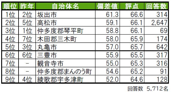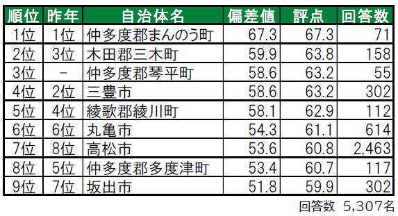 1位は、昨年2位だった坂出市です。2位は高松市で、「住みここち」「住みたい街」では1位の高い評価を得ています。3位は仲多度郡琴平町で、「街に愛着がある」2位、「住み続けたい街」3位となっています。