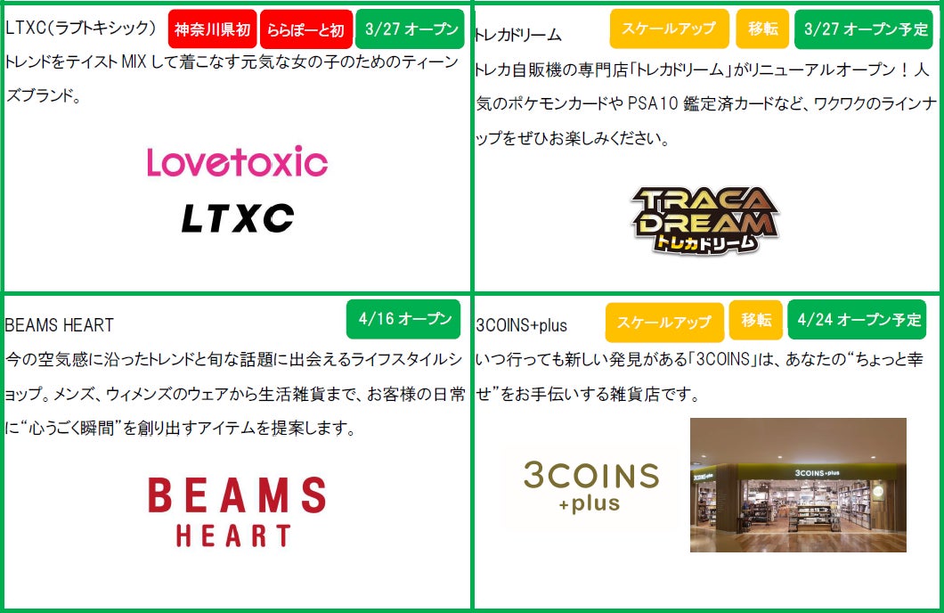 ・「ららぽーと横浜」グランドオープン(2007 年) https://www.mitsuifudosan.co.jp/corporate/news/2007/0123/ ・「ららぽーと横浜」大規模リニューアル完了 (2013 年) https://www.mitsuifudosan.co.jp/corporate/news/2013/0123_02/ https://www.mitsuifudosan.co.jp/corporate/news/2013/0718_01/ ・「ららぽーと横浜」大規模リニューアル(2016 年) https://www.mitsuifudosan.co.jp/corporate/news/2016/0307_01/ ・「ららぽーと横浜」リニューアルオープン(2019 年) |