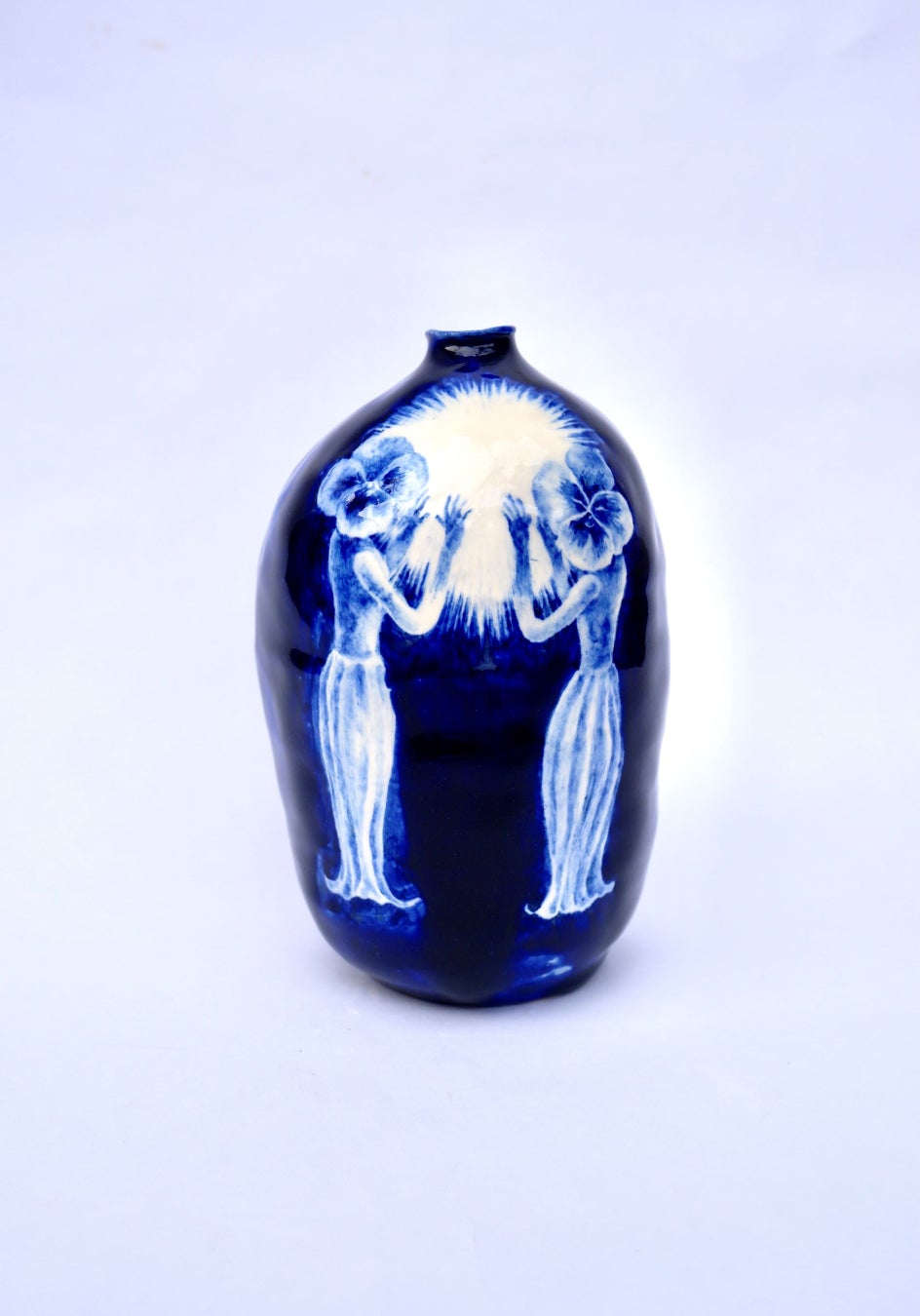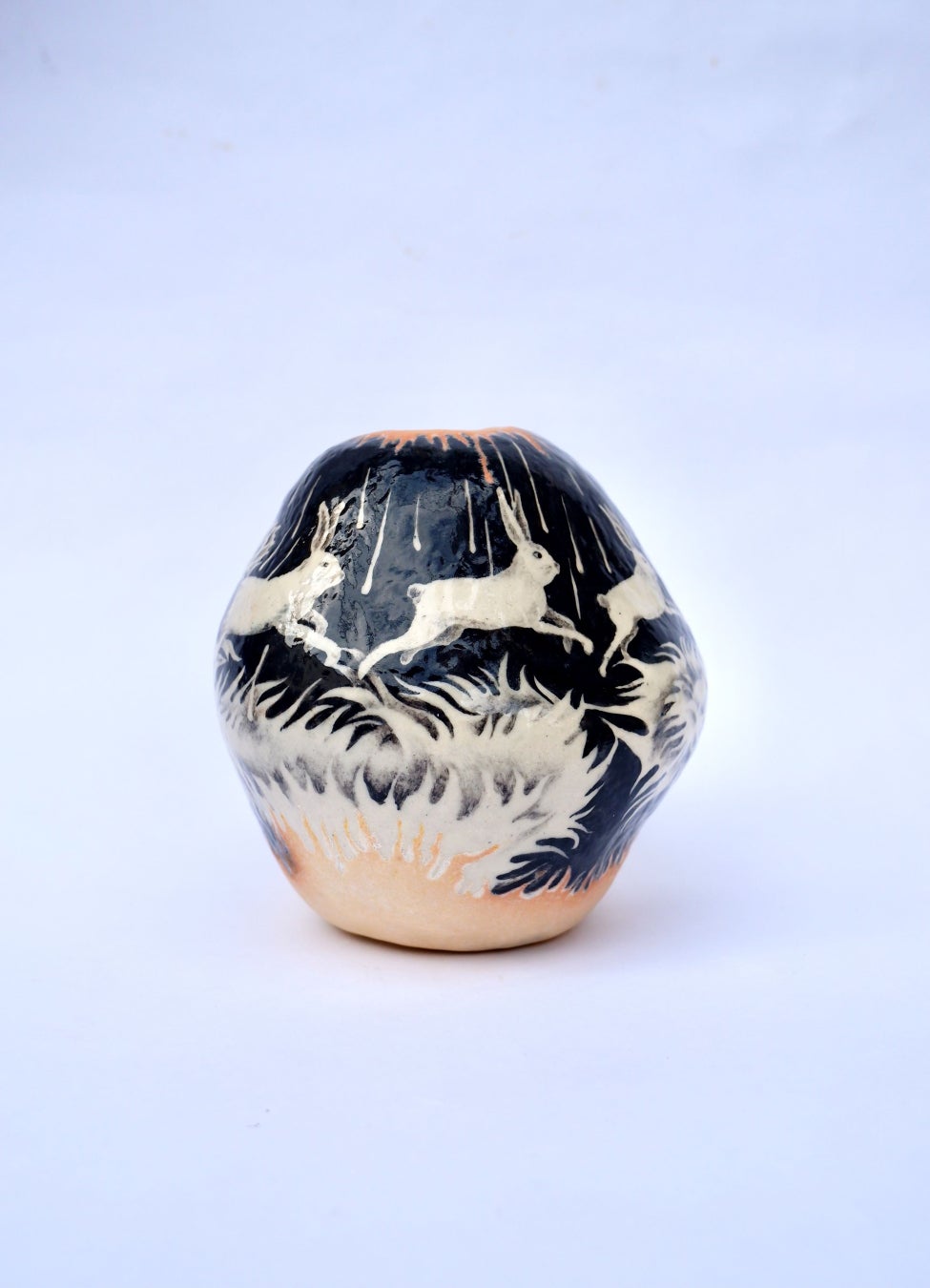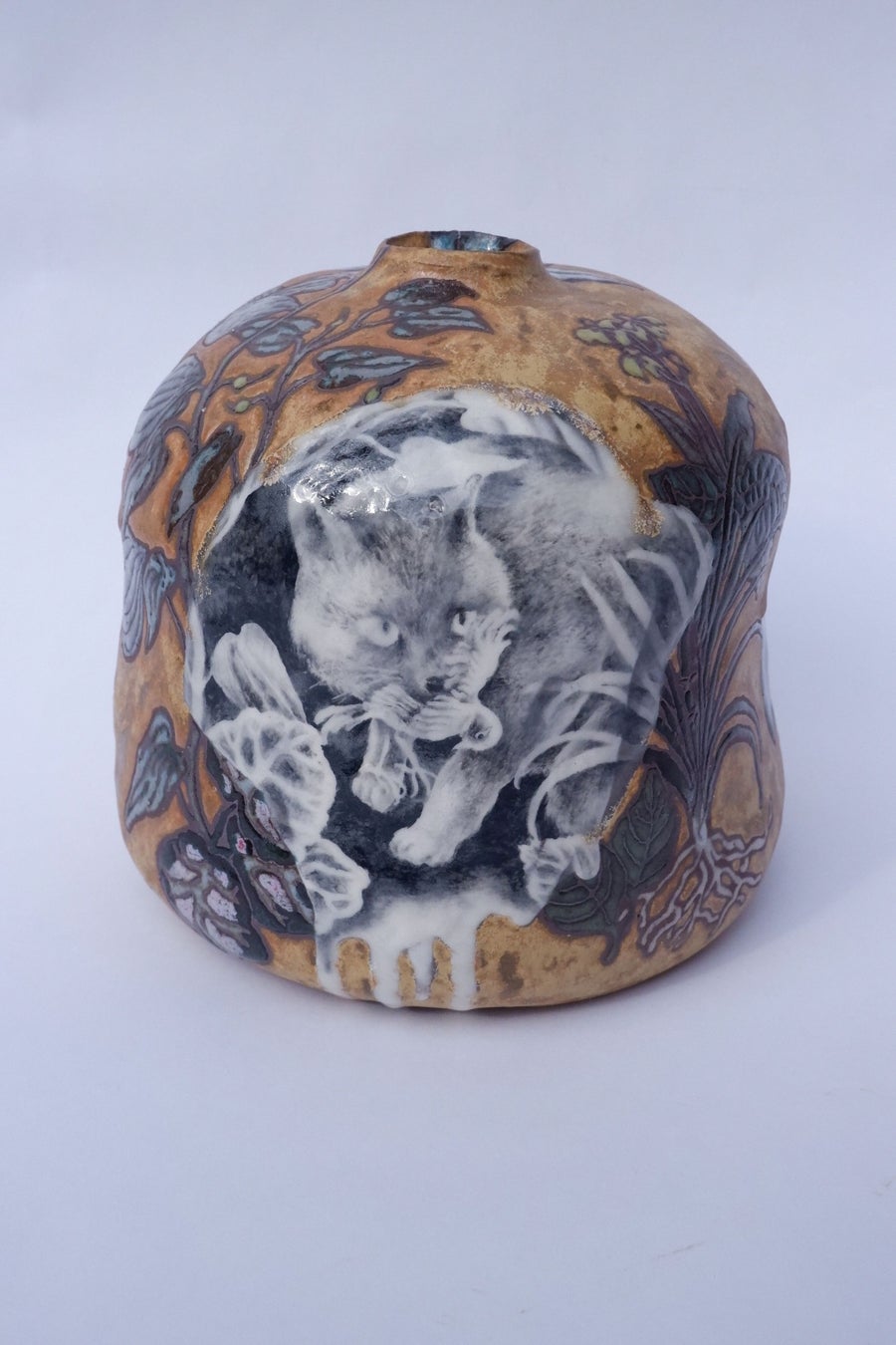 その思考のリズム感と制作中の感覚を「ぶつ切り、潜水」と表した本展では、今までほとんど使うことがなかった化粧土(※)を用いた新作を発表します。赤土の上から白い土で化粧を施し、白い部分と素地の色の差を活かした絵付けをすることで、同じ陶器の表面上に異なる質感が生まれます。手のひらサイズの小作品から高さ約60cmの大型作品まで約30点を展示します。
