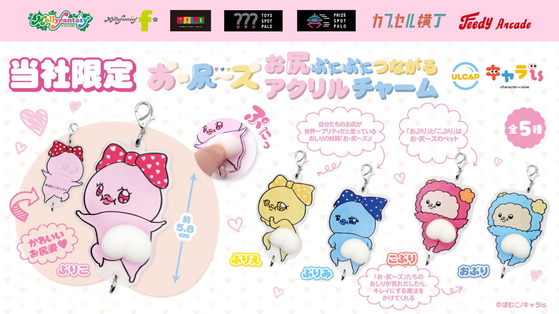 株式会社イオンファンタジー(本社:千葉県千葉市、代表取締役社長:藤原徳也、以下、当社)は、当社が運営するオリジナルキャラクター特化型プラットフォーム「キャラ is」(URL: https://charaise.jp/)から生まれたキャラクター「お・尻~ズ」のカプセルトイ用商品「お・尻〜ズ お尻ぷにぷにつながるアクリルチャーム」を、アミューズメント施設「モーリーファンタジー」「PALO」、カプセルトイ専門店「TOYS SPOT PALO」「カプセル横丁」などに設置する当社オリジナル完全キャッシュレスカプセルトイマシン「かぷえぼ」にて8月22日(金)より順次展開いたします。