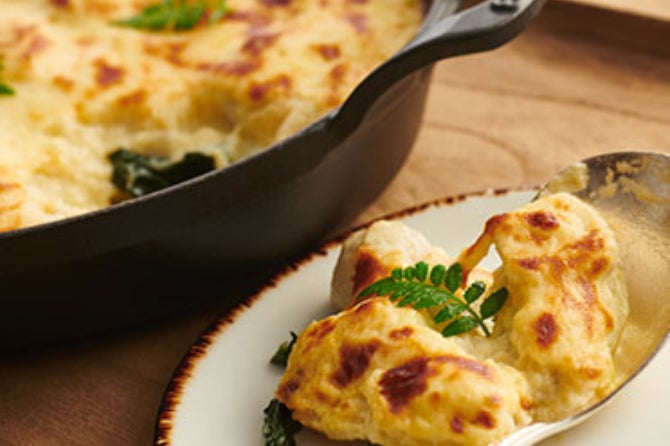 京都水尾の柚子胡椒と白味噌を合わせたベシャメルソースに京都の老舗「半兵衛麩」のなま麸と里芋をあわせた「なま麸 西京味噌グラタン」など京都の食材や調味料を活かした朝食ブッフェ(レストラン「ヴィスキオガーデン」)