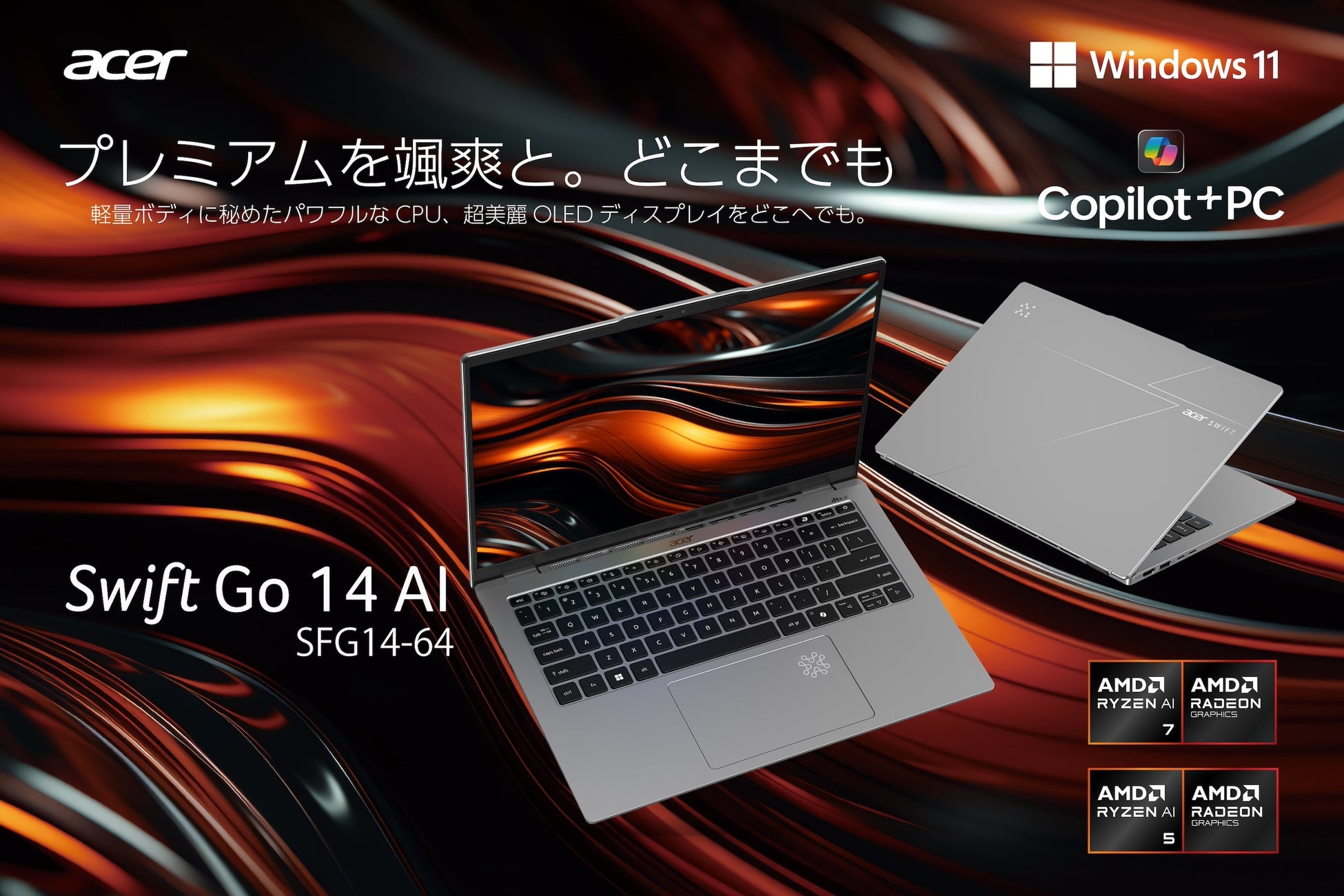 日本エイサー株式会社(本社:東京都新宿区、代表取締役社長:ボブ・セン)は、2025 年モデルのCopilot+PC 「Swift Go 14 AI」から、AMD Ryzen AI 300シリーズプロセッサーを搭載した「SFG14-64-N73Y/F」および「SFG14-64-N56Y/F」を、本日6月26日より、ヨドバシカメラ、ビックカメラグループ他、量販店ECサイトより順次発売いたします。