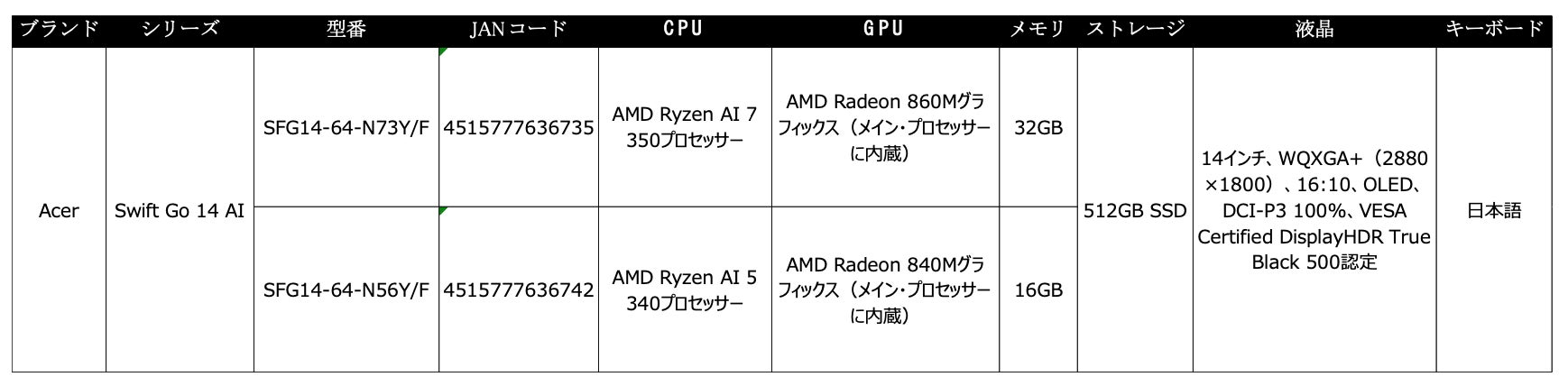 Ryzen AI 300シリーズプロセッサー搭載「Swift Go 14 AI」量販店モデルを本日より順次発売