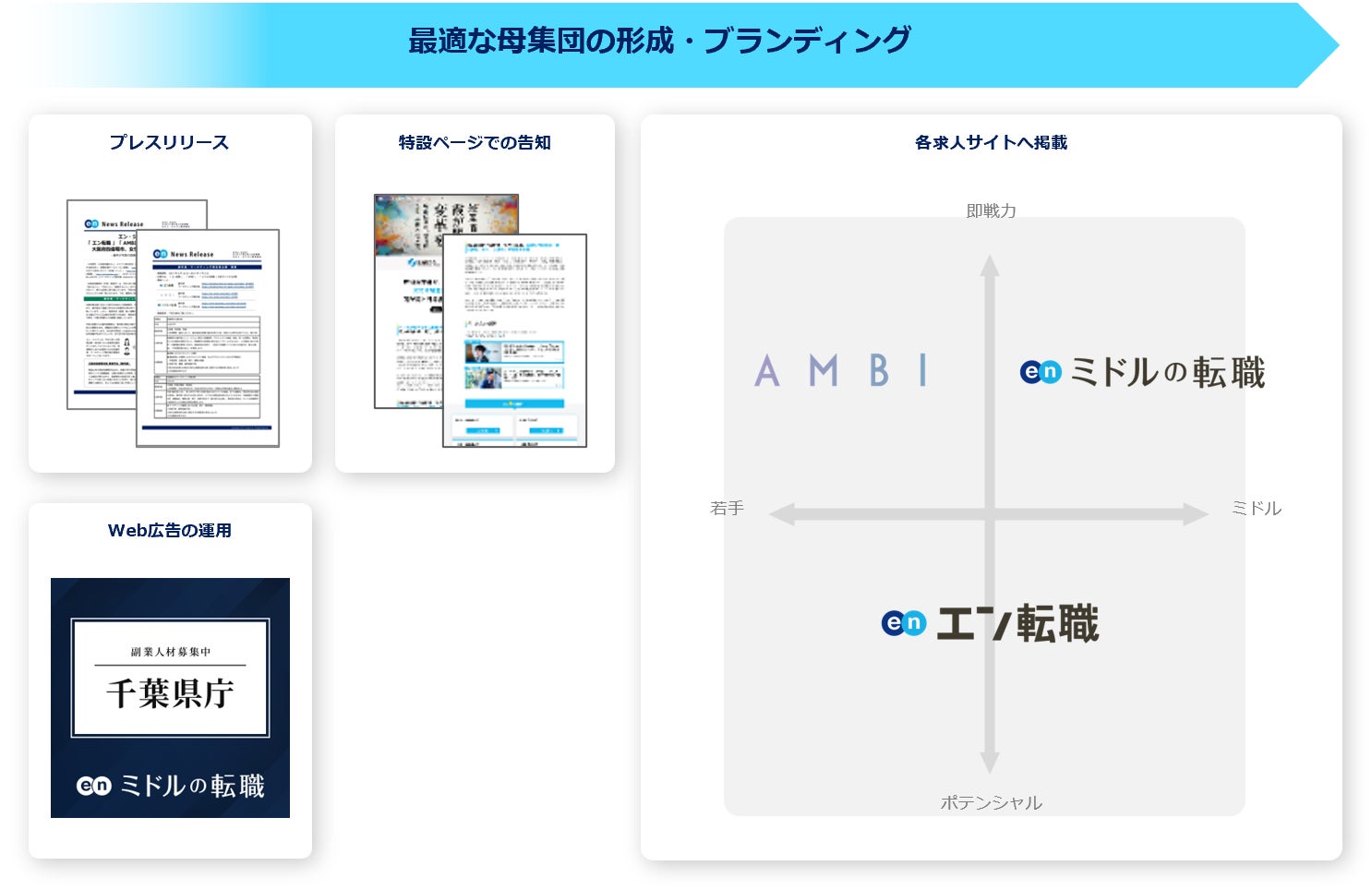 プレスリリースや特設ページ、Web広告での告知に加え、各求人サイトでの集客支援を実施。『エン転職』『AMBI』『ミドルの転職』とターゲットの異なる求人サイトを活用することで、ターゲットへ網羅的に求人を届けました。