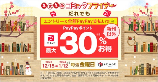 電子書籍販売サイト「ebookjapan」をLINEヤフー株式会社と協力して運営する株式会社イーブックイニシアティブジャパンは、ebookjapanで電子書籍を全額PayPay支払いで購入すると、決済金額に対してだれでも最大30%お得になる「年末年始の金曜日は全額PayPay支払いでお得キャンペーン」を、2023年12月15日(金)~2024年1月12日(金)に実施します。