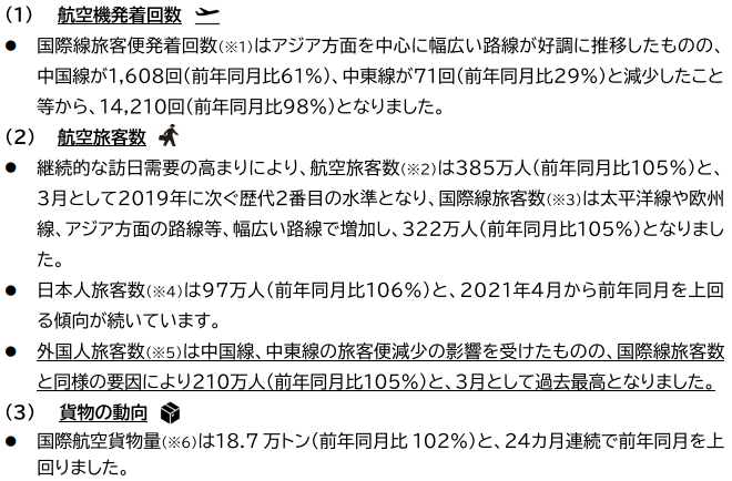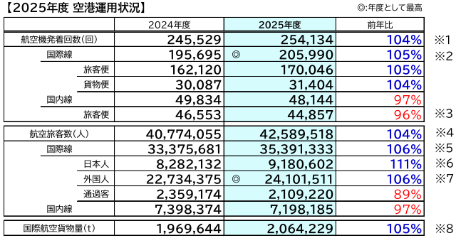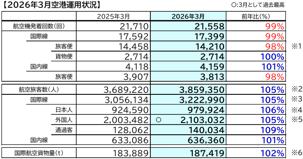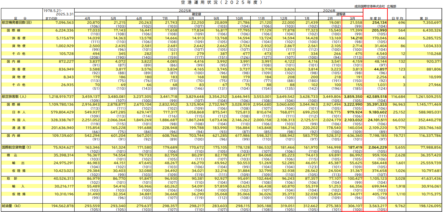 2026年3月 空港運用状況 外国人旅客数が3月として過去最高に成田国際空港株式会社2026年4月30日 09時30分いいね!数を読み込み中です 2025年度 空港運用状況 国際線発着回数及び外国人旅客数が年度として過去最高に 航空旅客数及び国際線旅客数が歴代2番目の水準に すべての画像種類経営情報ビジネスカテゴリ交通・運送・引越しキーワード成田国際空港2026年3月2025年度空港運用状況外国人旅客数 3月として過去最高2018年度に次ぐ歴代2番目の水準位置情報千葉県成田市(本社・支社)関連リンクhttps://www.narita-airport.jp/ja/company/ダウンロードプレスリリース素材このプレスリリース内で使われている画像ファイルがダウンロードできます