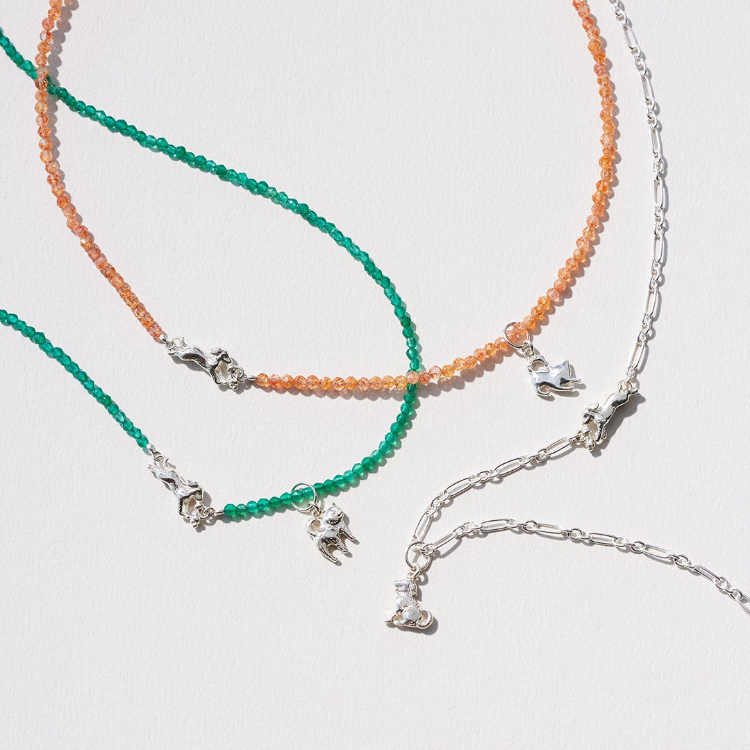 おもちゃを追いかけながら元気に走り回る仔犬のモチーフが隠れたネックレスと、チワワ、柴犬、ラブラドールレトリバーをモチーフにしたチャーム。遊び心あるコーディネートを楽しんで。