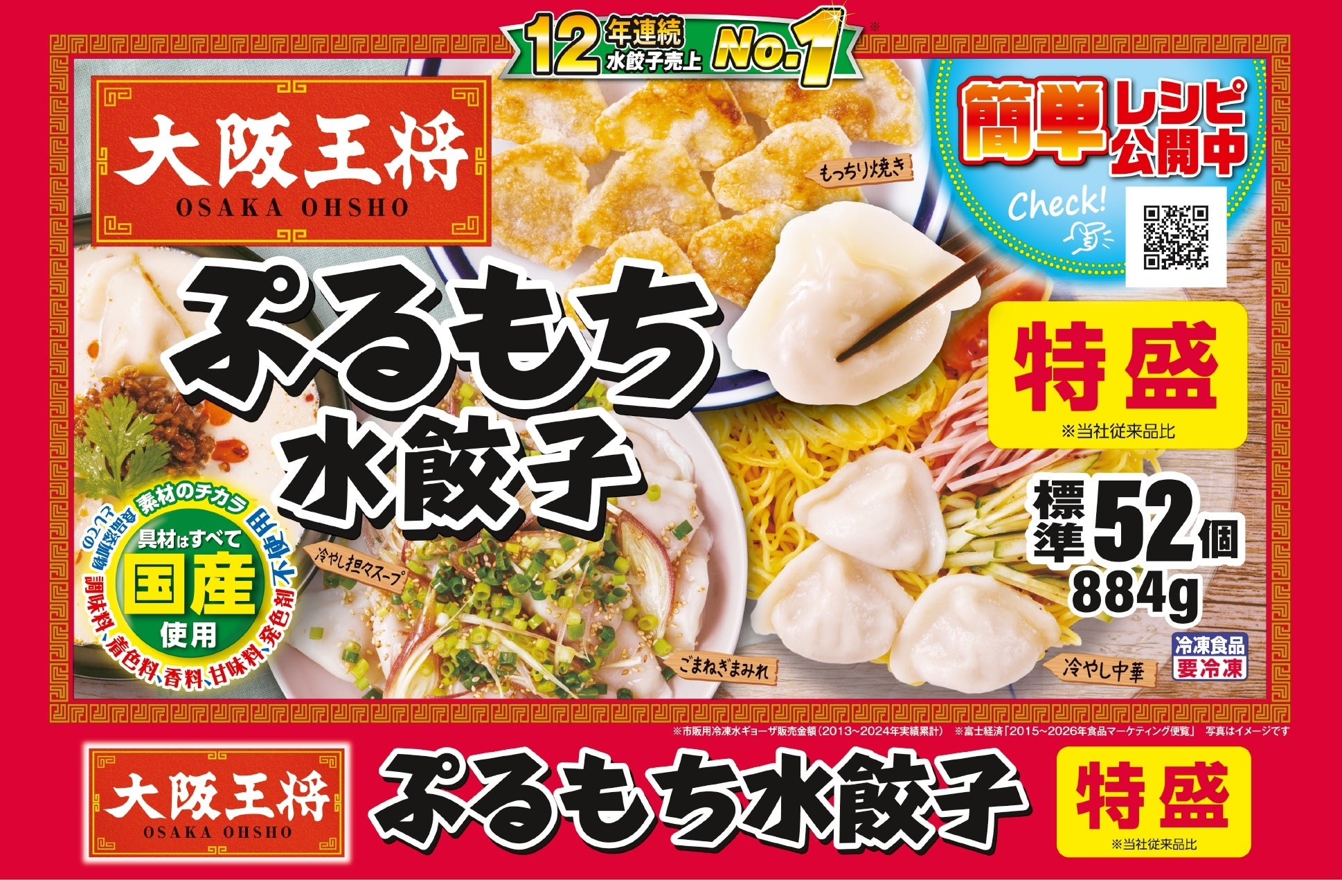 大阪王将が冷凍水餃子の販売を始めて21年。お鍋やスープにポンッと入れるだけ、簡単調理の認知が広がり、焼き餃子が主流の餃子市場において、水餃子の市場規模も年々拡大しています。白ネギと自家製ねぎ油を追加、しょうがとニラを増量。キャベツも増量して、旨みや甘みを活かした味わいに。具の食感を改良し、食べ応えもアップしています。香味野菜で春夏に食べたくなる香りや味わいを引き立てています。いつものスープに入れるだけで、簡単ボリュームアップ。火を使わずレンジ調理でポン酢をつけて食べるなどプラス一品に嬉しい商品です。