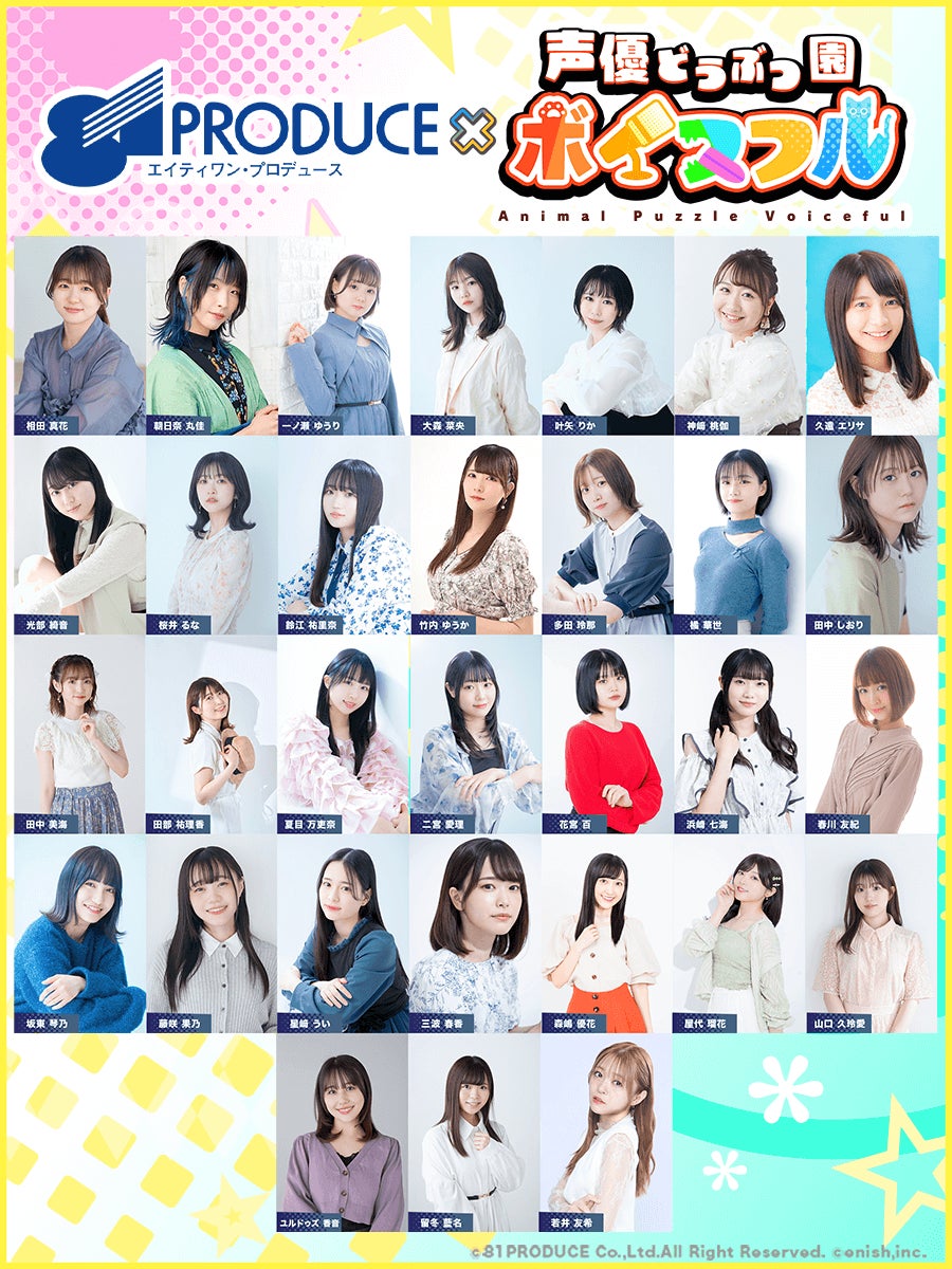 本プロジェクトには、81プロデュース所属の31名の声優が参加いたします。それぞれが個性豊かなキャラクターの声を担当し、ゲームの世界観を彩ります。今後、段階的に情報公開を行っていきますのでぜひ、皆さんの推しボイスを見つけてみてください!