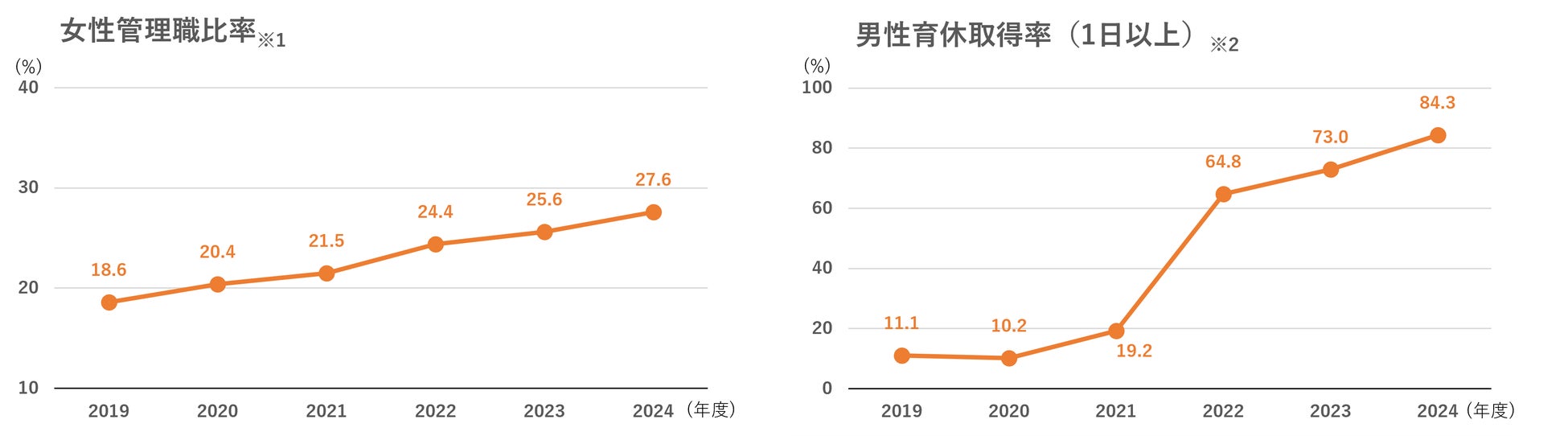 また男性育休取得率(1日以上)は、2026年までに100%を目指す中、2024年度実績は84.3%。前年(2023年度実績)比11.3pt増で過去最高となりました。