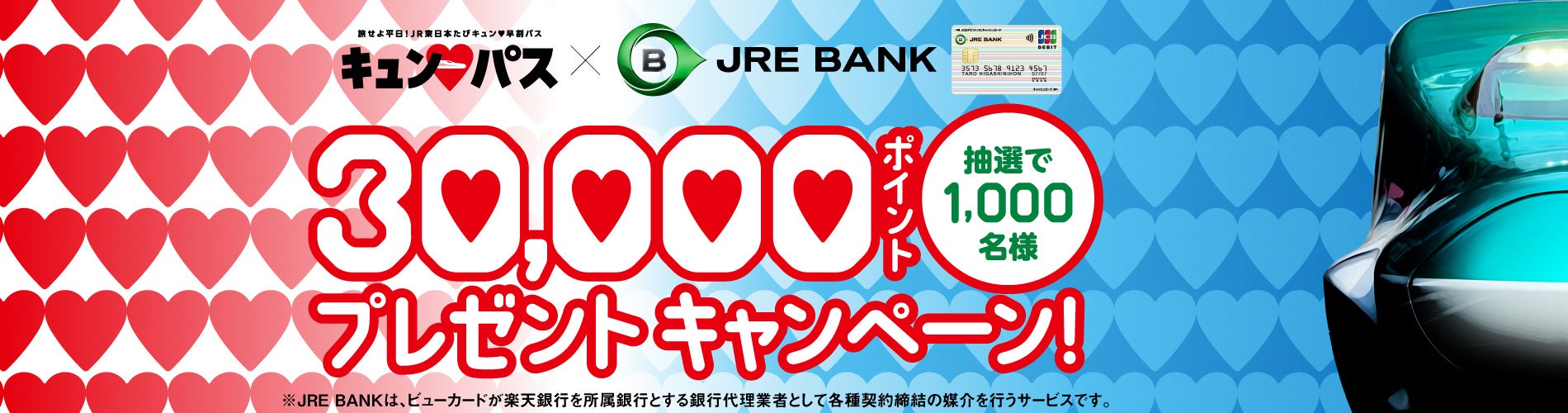 1.キュン♥パスを「JRE BANKデビット」で購入すると30,000ポイントを抽選でプレゼント!