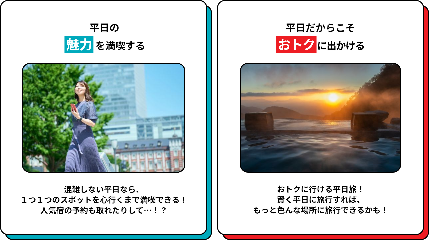 ○JR東日本グループは「変革2027」において「地方を豊かに」をコンセプトに、「地域間」「地域内」の観光流動の拡大を目指します。 ○多くのお客さまに「平日に旅行へ行きたい!」と思っていただけるきっかけとして、平日限定の「おトクな商品」の設定や地域の魅力、旬なイベント情報などを発信し、JR東日本エリアの観光の魅力を体感いただくことから地域の活性化に取り組んでいきます。 |