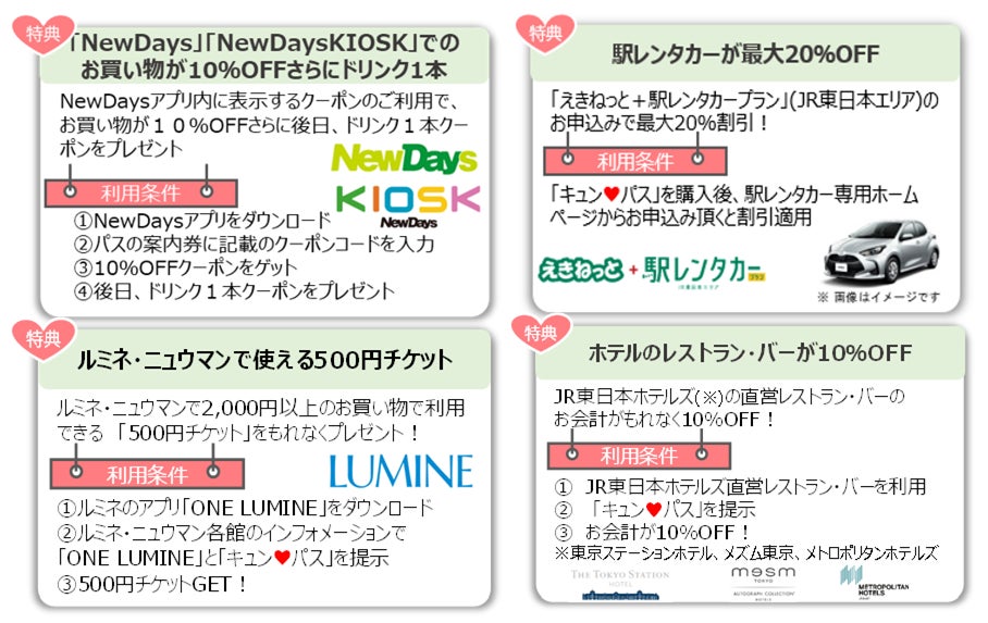 キュン♥パスをご購入いただいたお客さまには、おトクなキャンペーンや特典、割引サービスを多数ご用意しています。