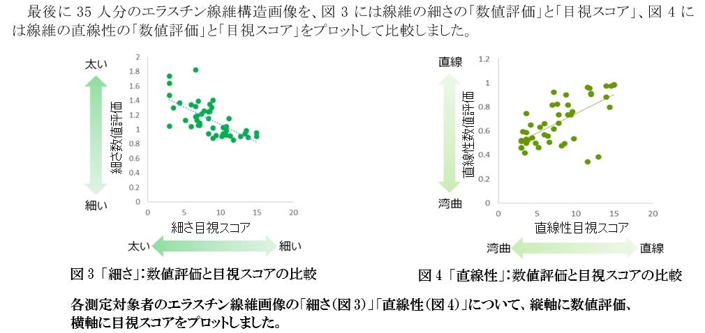 さらに、このエラスチン線維構造の客観的な数値評価法を用いて解析することで、エラスチン線維の質を決める構造は、40代で急激に直線性が低下して湾曲する変化が起こっていることが確認されました。このことは、シワ、たるみの老化兆候が顕著となる年代と一致し、この老化兆候を予防するためには、40代までのエラスチン線維の構造変化を抑制することが重要となることが示唆されました。