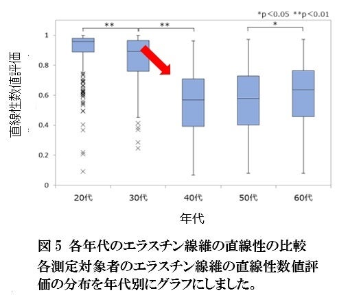 その結果、加齢によりエラスチン線維の直線性の低下が認められ、40代で急激に低下が起こっていることが確認されました(図5)。