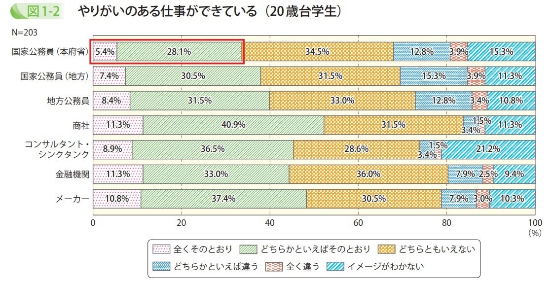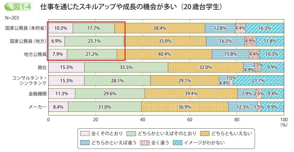 一方で、人事院が2025年に実施した「国家公務員イメージ調査」によれば、20代学生の中では、国家公務員(特に本府省)の「やりがい」や「成長機会」に対する肯定的イメージが他業界と比較して低いという結果が明らかになりました。制度改革や働きやすさ向上の取り組みが進む一方、その価値が若年層に十分に届いていないという“認知ギャップ”が存在しています。