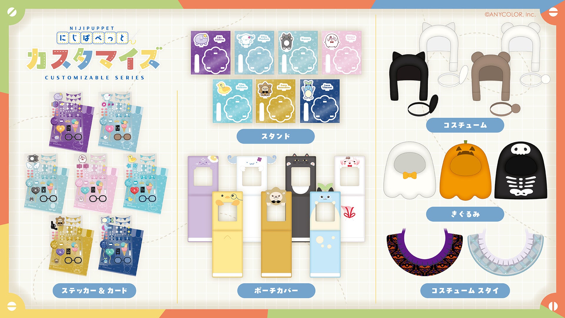 グッズラインナップは、7名のマスコットキャラクターを使用したステッカー&カードセット、ポーチカバー、スタンド。さらに、にじぱぺっとに着せて遊べるきぐるみ、コスチュームを加えた計7種類!