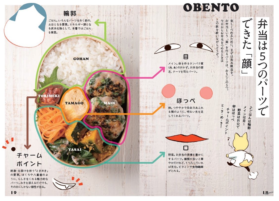 「輪郭」はごはん、「目」はおかず、「口」は野菜など5つの要素で「顔」をつくるイメージで詰めると栄養バランス、彩りも整って、開けたとき「おいしそう!」なお弁当になります。
