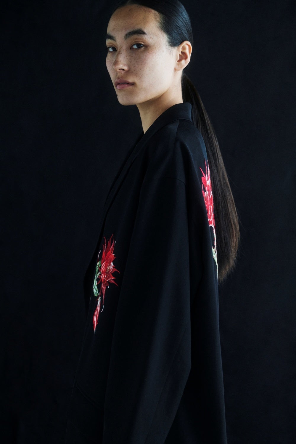 立体的なボリュームと温かみ、微妙な個体差のある手振り刺繍を施したウールギャバジンジャケット。刺繍は角度によって表情や色合いが微かに揺らぐ。アシンメトリーなシルエット。