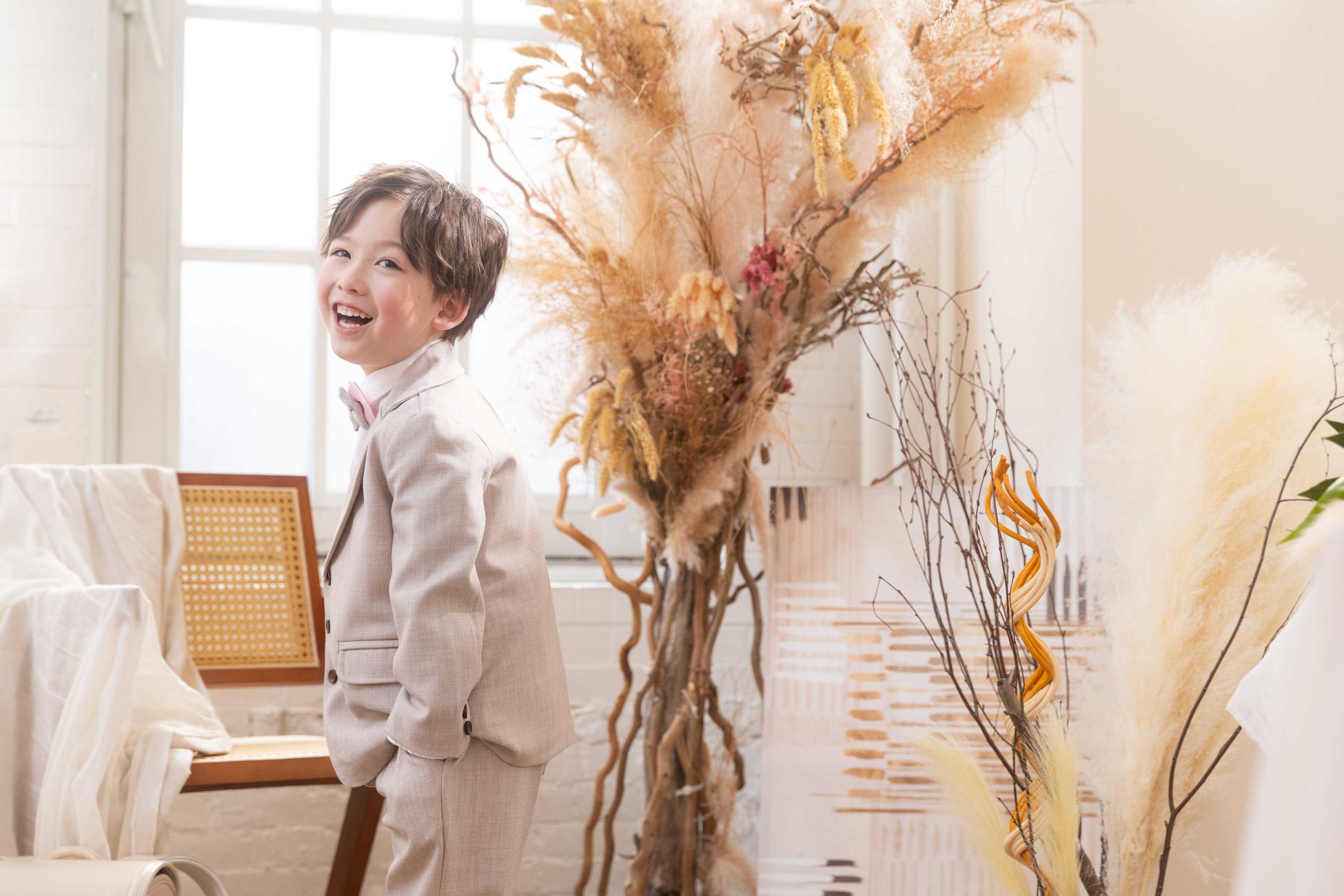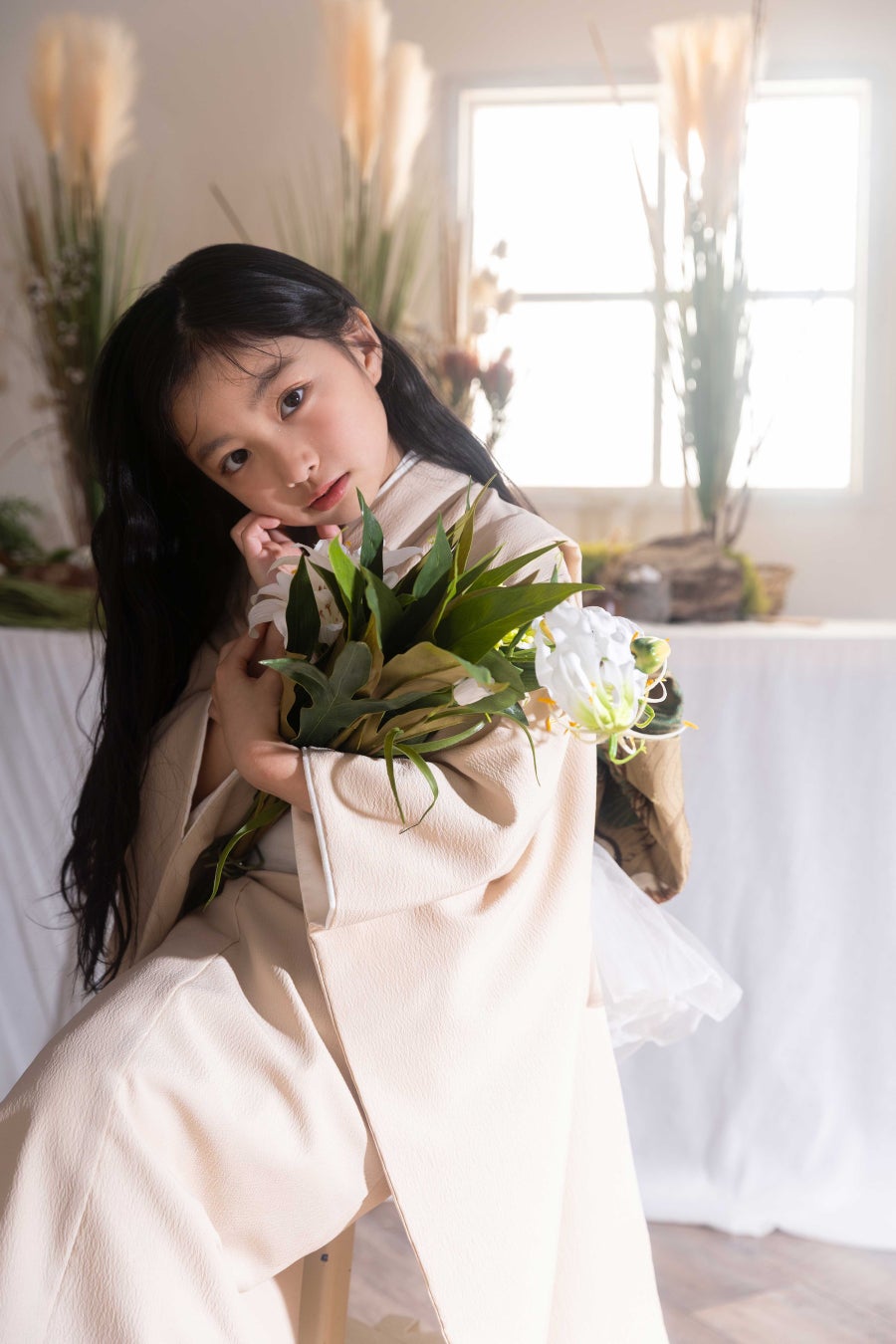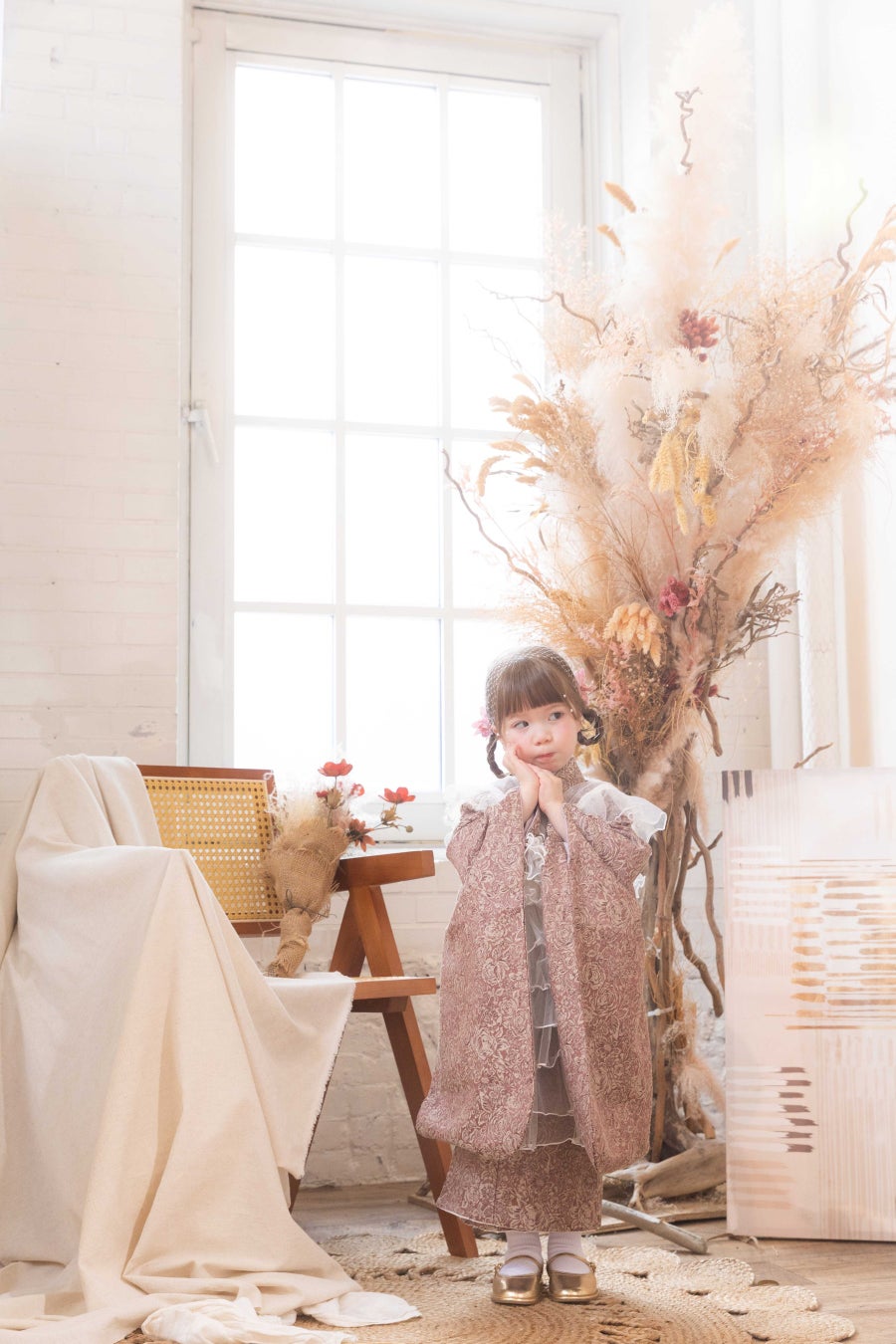ご記念を迎えたお子様の未来を灯すような存在でありたいと願いをこめて名付けました。和室の雰囲気を残しつつ、洋装のご撮影も楽しんでいただけるようお花や植物をたくさん使用した背景となっております。おしゃれなテーブルセットなど新たなナチュラル和空間を提供します。