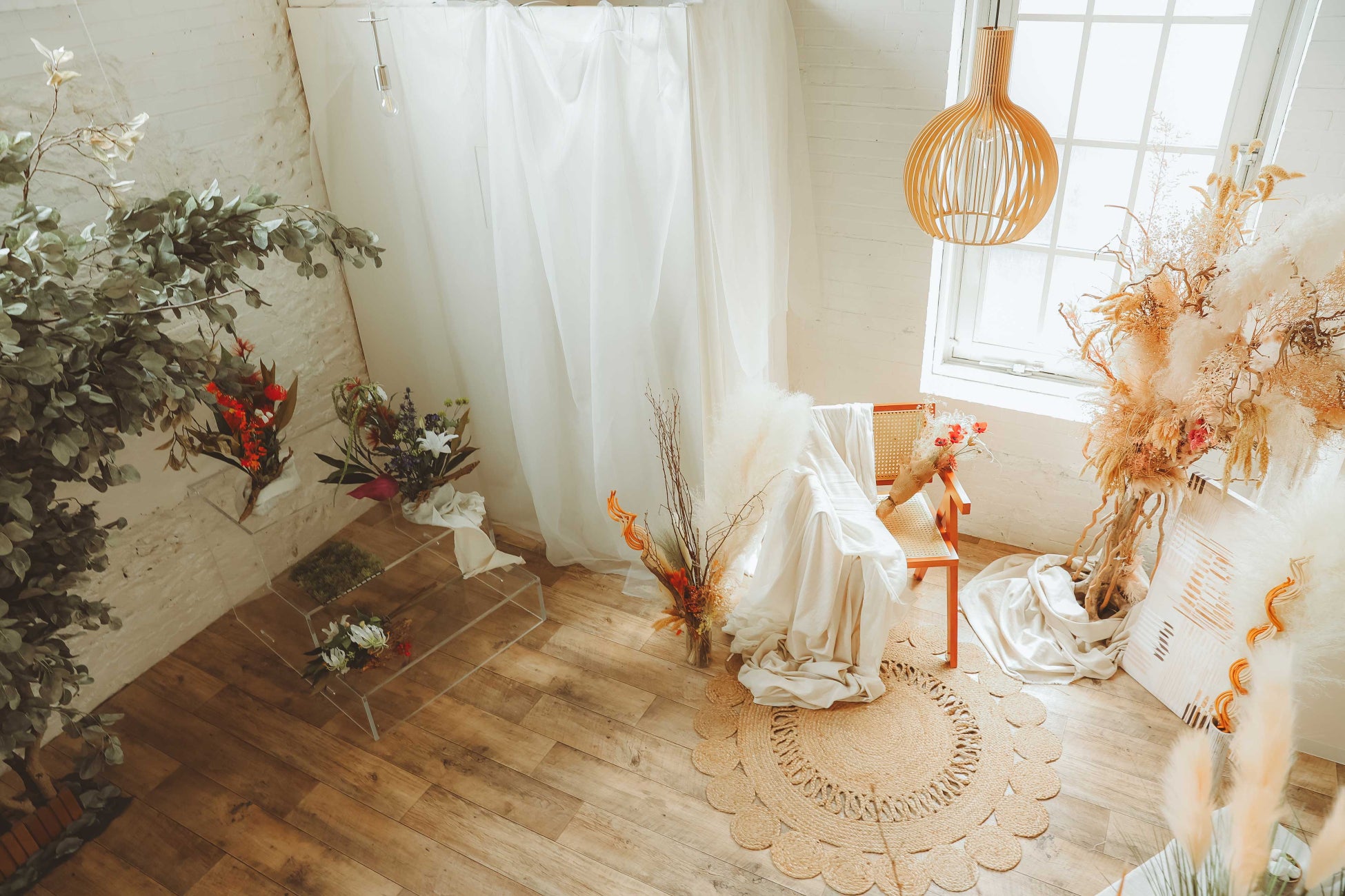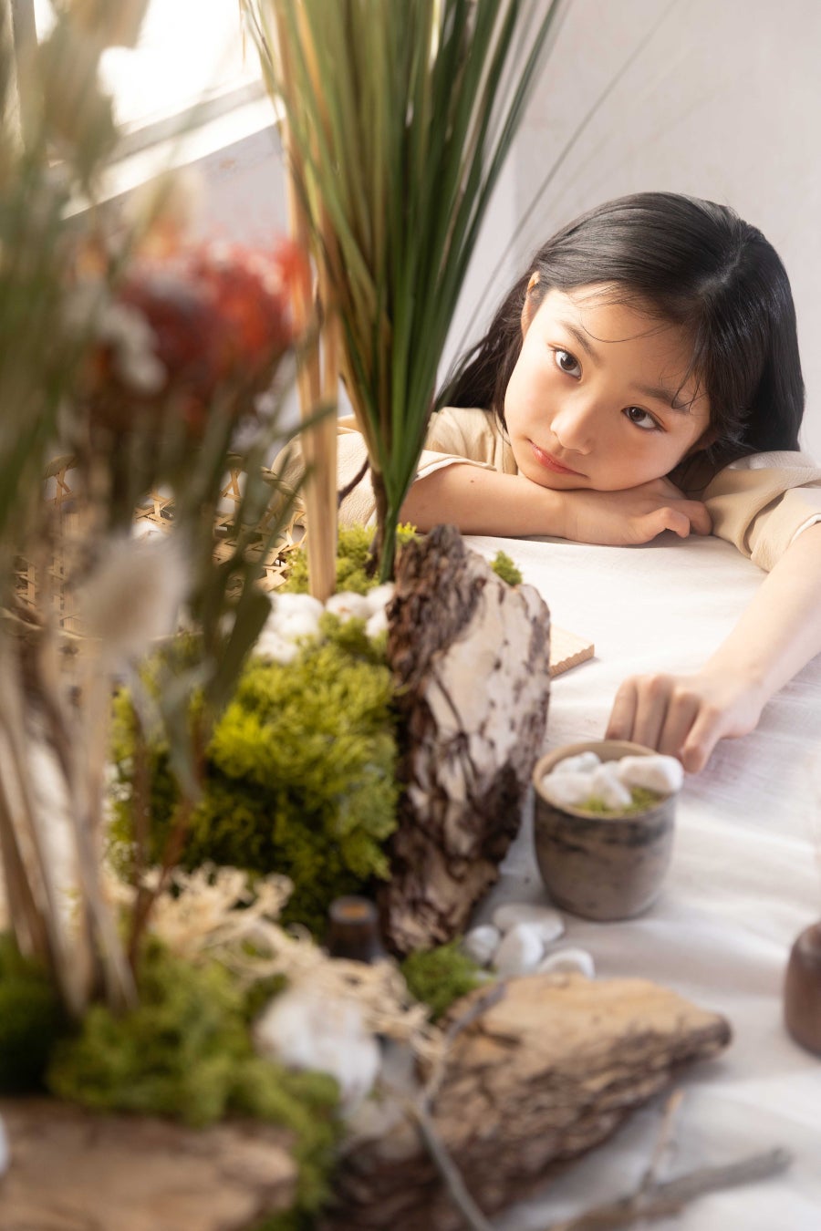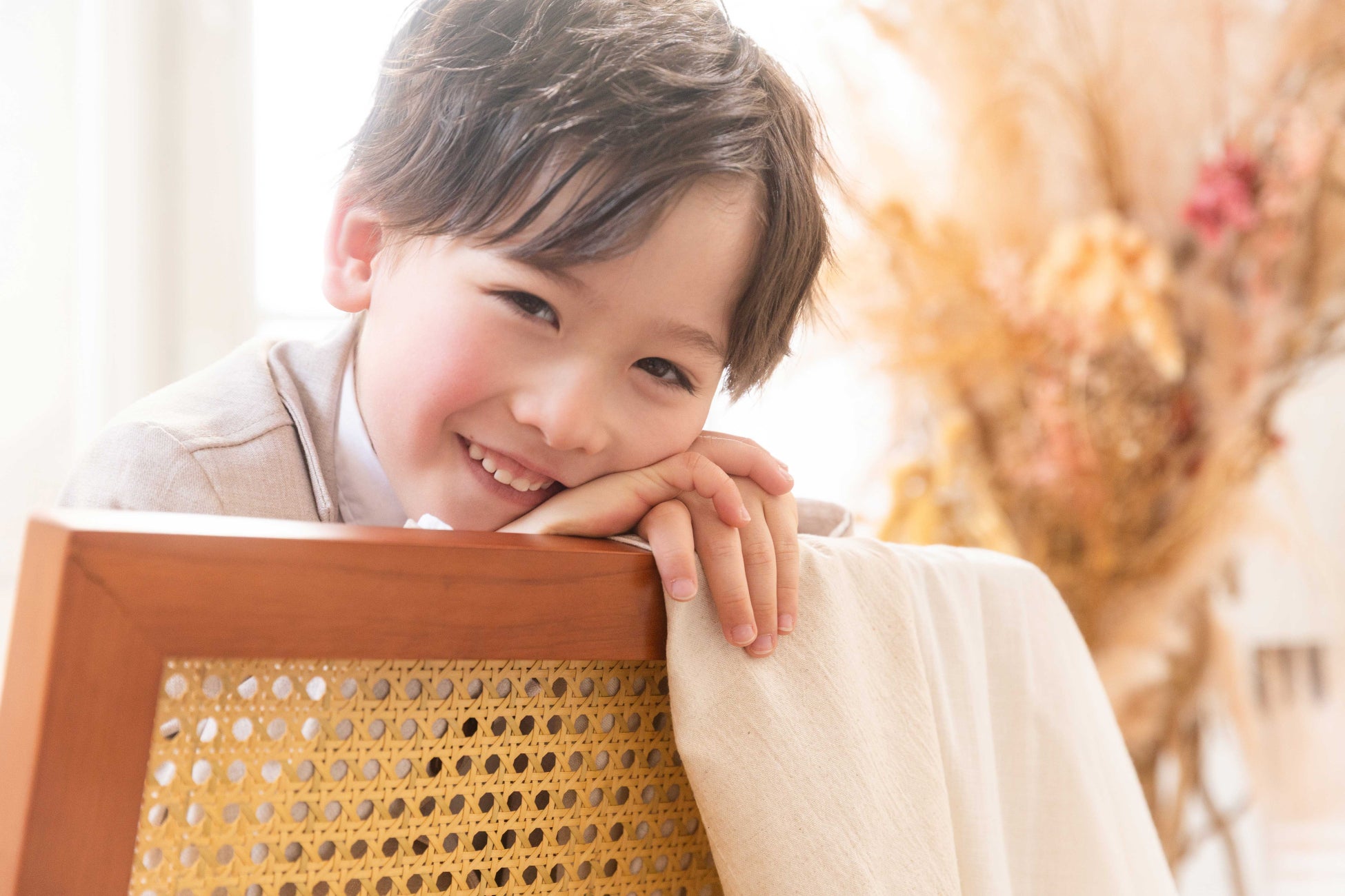 ご記念を迎えたお子様の未来を灯すような存在でありたいと願いをこめて名付けました。和室の雰囲気を残しつつ、洋装のご撮影も楽しんでいただけるようお花や植物をたくさん使用した背景となっております。おしゃれなテーブルセットなど新たなナチュラル和空間を提供します。