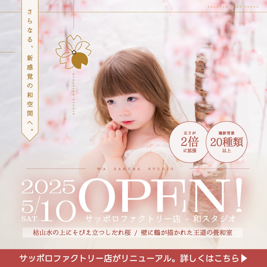 ベビー&キッズ撮影をご検討の方必見!写真工房ぱれっとサッポロファクトリー店に新感覚の和空間が登場。スタジオの広さが2倍、撮影背景も20種類以上!充実感のスタジオへパワーアップしました。